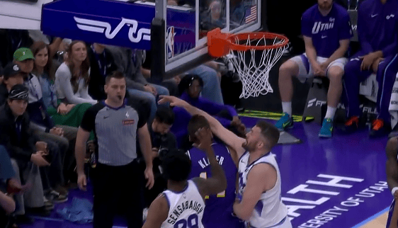 第四节比赛中,克勒贝尔拉杆上篮被乐福打到面部,裁判回看吹罚普通犯规。