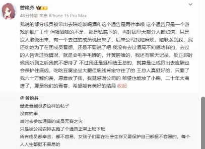 与鞠婧祎同时期进入丝芭传媒的SNH48前成员曾艳芬发文,透露公司想融资上市时期,部分成员还被安排去陪老板喝酒。 同日,丝芭传媒发文回应被曝让艺人陪酒一事,称“平白无故仅凭道听途说污蔑团里所有成员的清白,恶意放大抹黑过去的同伴”,表示所有不实言论已报警、已委托律师取证、提告。 ​​​
