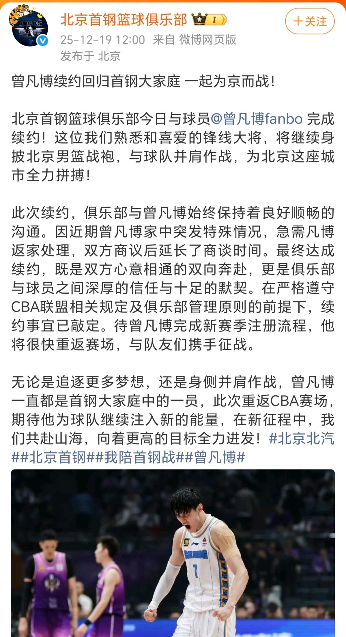 各自官宣!曾凡博正式回归,最强“全华班”诞生! 曾凡博重新回到北汽男篮,本人以及北汽男篮官方俱乐部正式官宣,不日,即将正式回归赛场。作为去年的亚军,惜败广厦成了众多北汽球迷的意难平,小曾作为最后一块拼图聚齐,新赛季北汽向总冠军发起最有利的冲击。 坐拥周琦、赵睿、陈盈骏、曾凡博四名全明星级别的球员,北汽堪称最强“全华班”。论纸面实力来看,目前能对北汽造成威胁的只有上海和广厦,上海保留核心班底引入古德温、怀特塞德、张镇麟,但目前磨合不够,整个球队还未建立真正的化学反应;广厦则保存了去年的夺冠核心阵容。但是国手赵睿的加入+曾凡博回归,健康的北汽将成为新赛季最大夺冠热门。