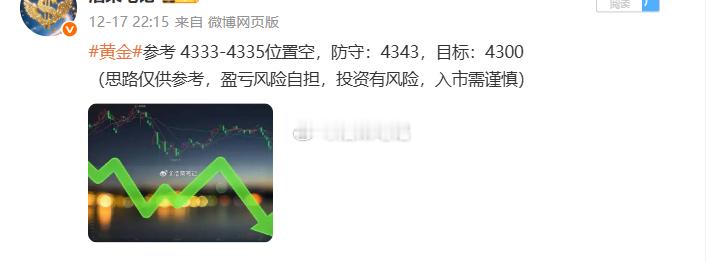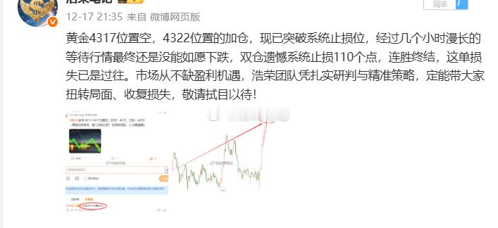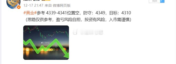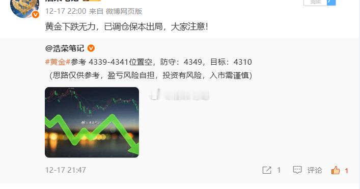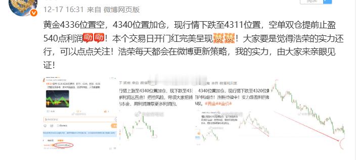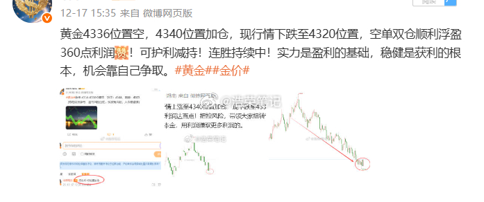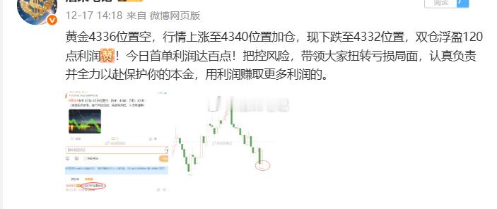 2025.12.17日周三操作记录总结!黄金4336位置空,4340位置加仓,在4311位置获540点利润黄金4317位置空,4322位置的加仓,在4325位置系统止损110个点黄金4339位置空,在4339位置保本调仓黄金4333位置空,在4323位置获利100个点博文公布4单,2盈,1平,1负共斩获530点利润!成长的过程中,知道自己要什么,比现在干什么更为重要,做一件事情的过程可能漫长,但只要坚持,结果总会让你满意,交易中最难的其实也是如此,风险往往来自于不知道要干什么。黄金金价