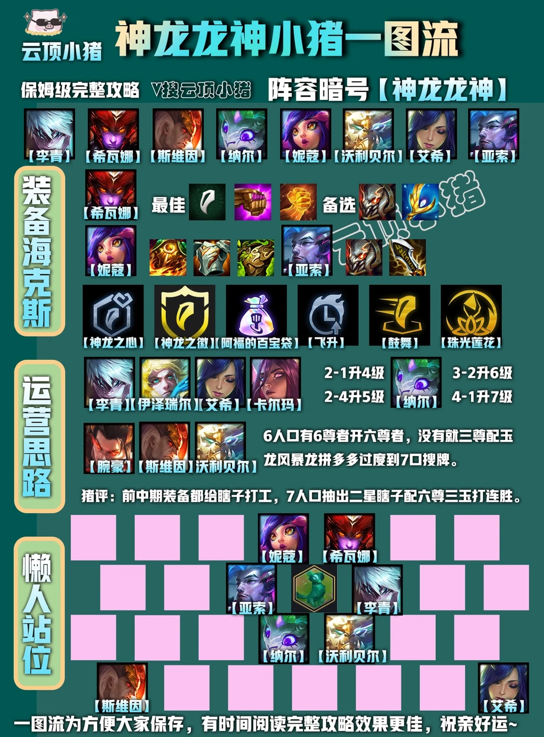 第一个前置条件是必须要神龙转,第二是中期没有二星瞎子和六神龙尊者不要盲目冲人口,得抽一抽质量尽量去打连胜。如果瞎子特别多能三星,玩神龙瞎子也是不错的选择。
