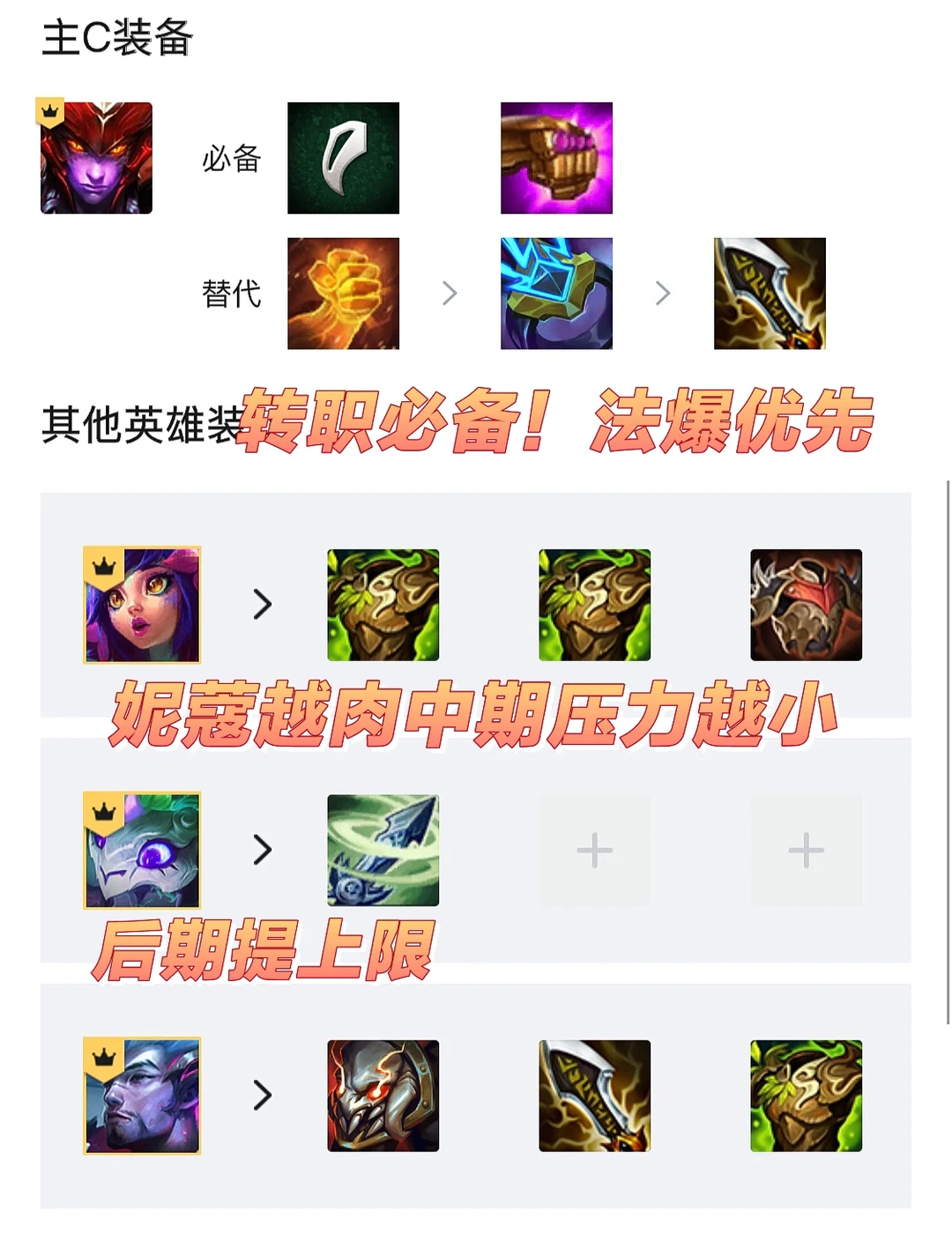 前期肉装和AP装备都无脑合打连胜,装备给瞎子打工过度,妮蔻至少要两件套,中期4、5阶段强度会高很多。打后期再补强亚索的装备以及拿一些功能装(吹风射线)。