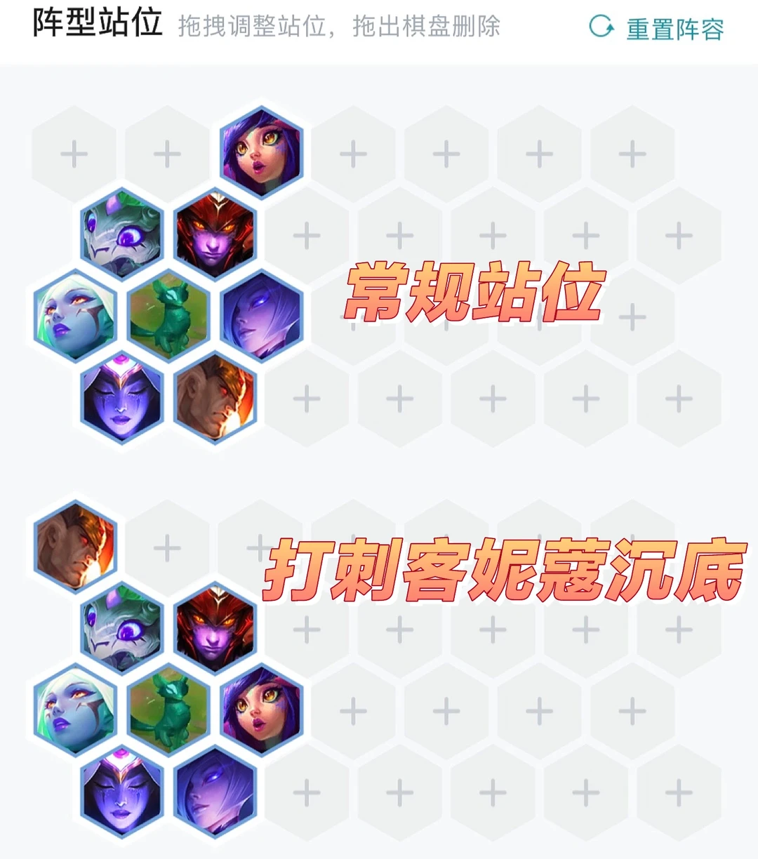 上图是正常站位,下图是打刺客妮蔻沉底随便打。正常站位要注意妮蔻不要被吹风了,特别伤,打腕豪要灵活移动妮蔻去档腕豪,对其他阵容都放中间。