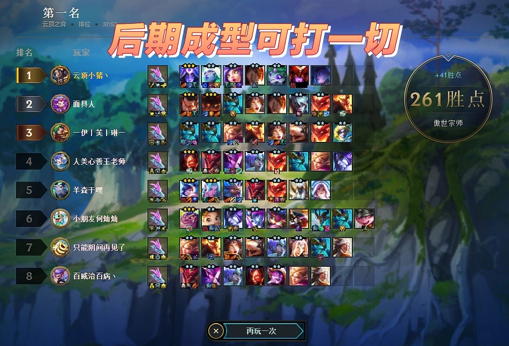 开局用三星界摆烂连败到石头人就行,大概还有60-70血量,不要慌,然后直接3-1梭哈追出三星豹女,然后留一下三玉的牌,星界牌带两个斗士卖,6级还能贪。