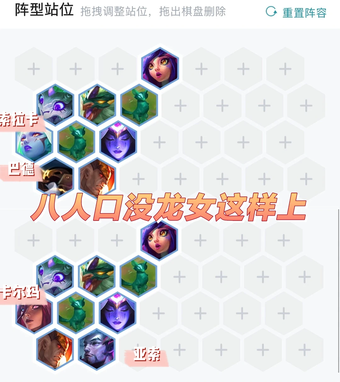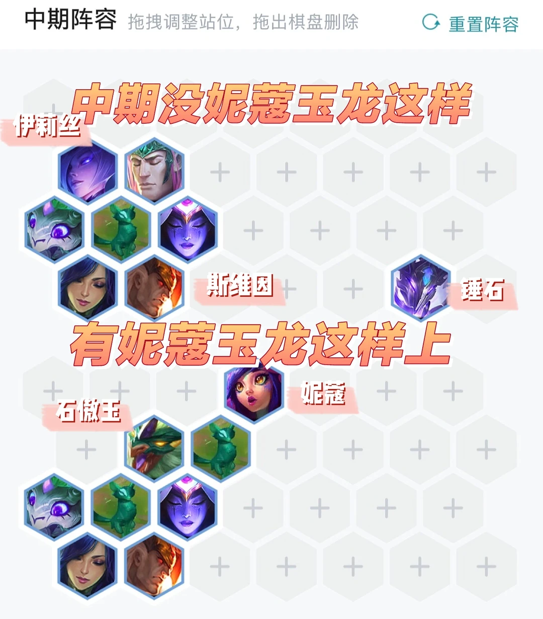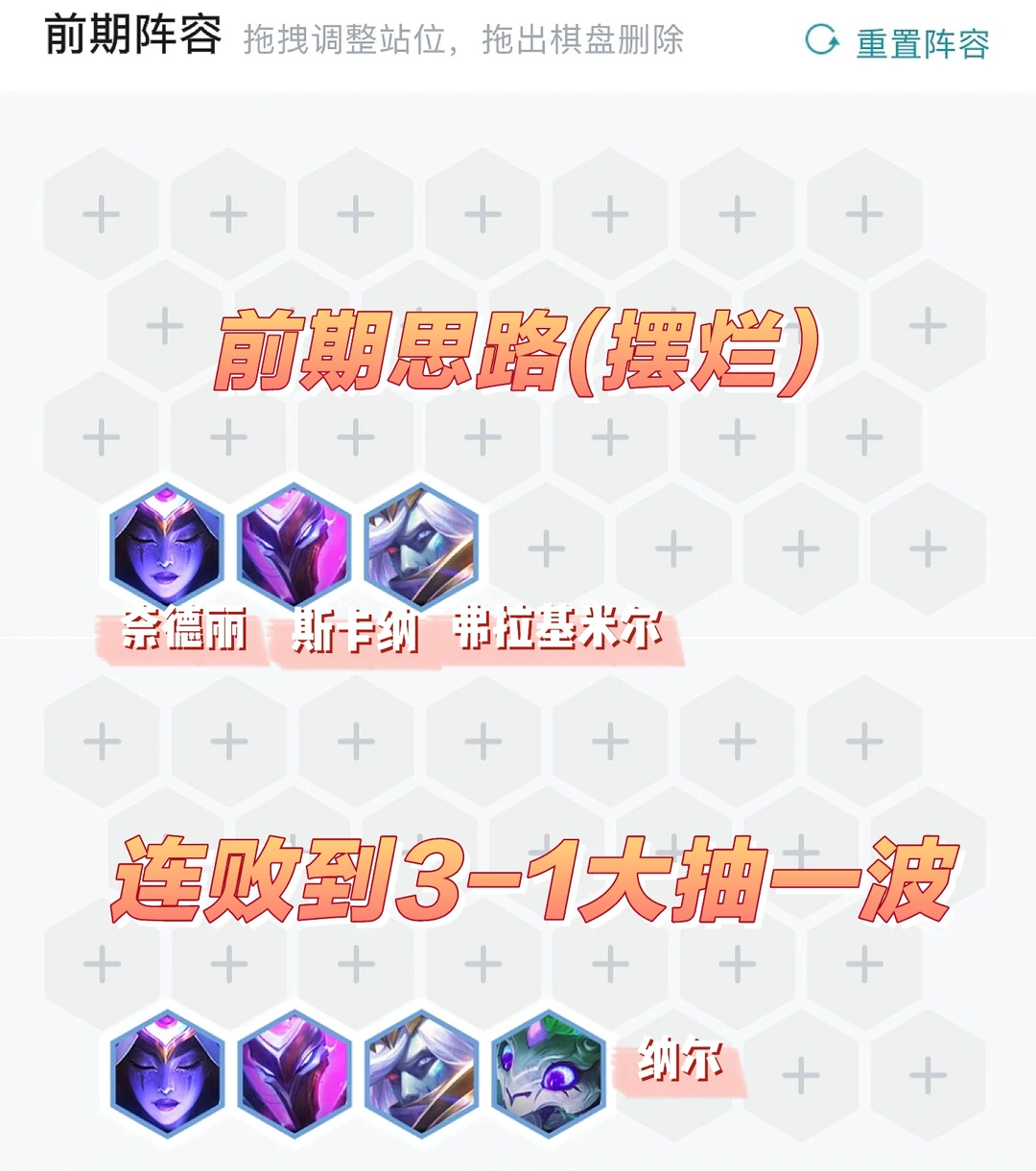 这套纳尔和其他换形师都不追三,没有必要,会卡你很多经济,必须速8找到二星妮蔻最为核心,4阶段上7,5阶段上8二星妮蔻算是成功,6阶段有龙女就有登顶之力。