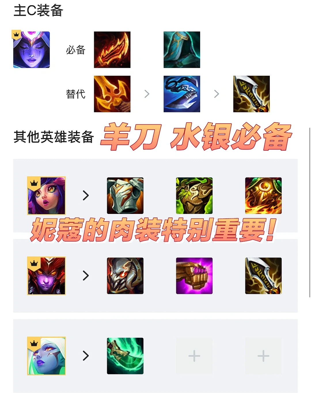 豹女核心装备是水银和羊刀必备,然后优先杀人剑,其次有就做巨杀、无尽,一定不要等!然后最关键的是妮蔻的肉装,这个特别重要,可能也是很多小伙伴没分的关键,妮蔻必须两件套以上,是必须。