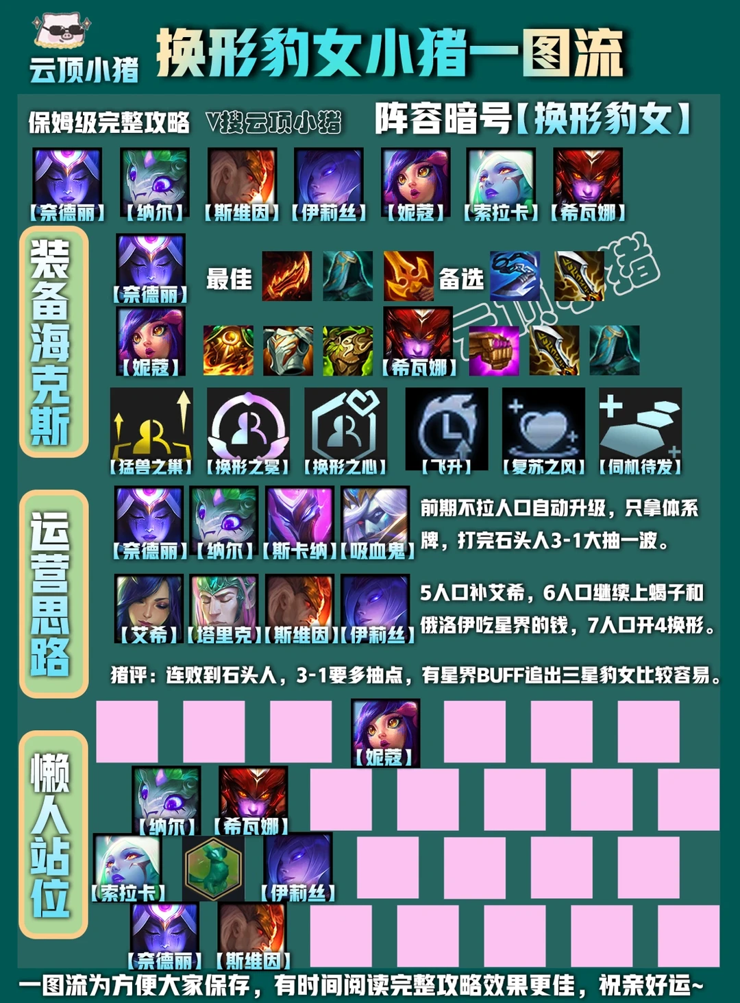 [赞R]今天给大家推荐一套版本大热的换形赌豹女的玩法,这套阵容后期大成能打一切阵容,难在3、4阶段对强度的理解和把控,什么时候抽牌搭配玉还是换形?今天小猪就把这套几个关键点和转型思路分享给大家。