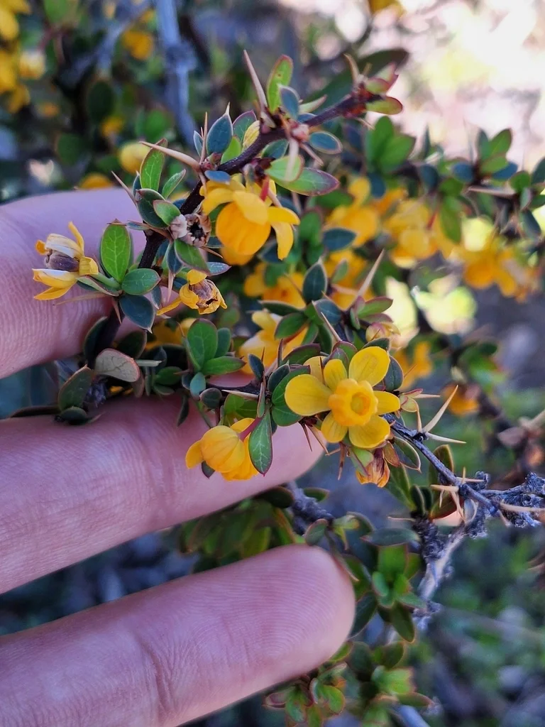 灌木生长到1.0到1.5米(3英尺3英寸到4英尺11英寸)的高度。它有许多拱形的分支,每个分支上都覆盖着许多三重的刺。这棵灌木在夏天开了许多淡黄色的花。它产蓝黑色浆果。