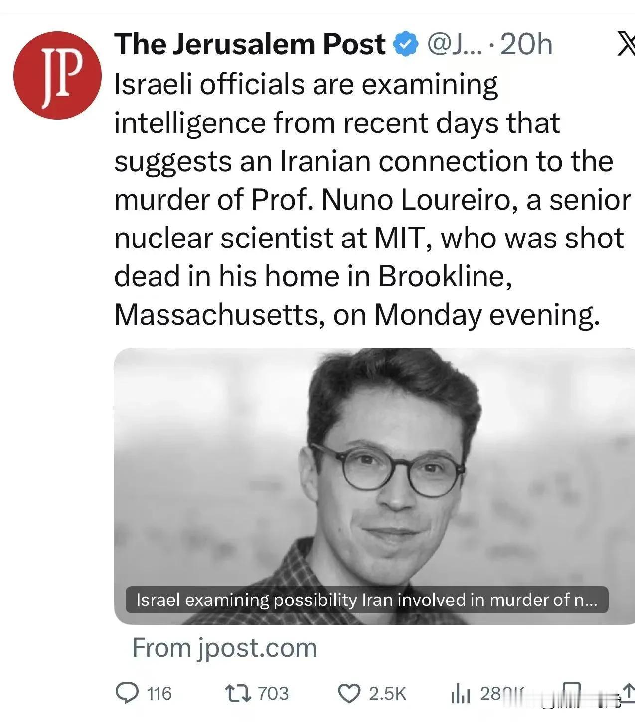 JP耶路撒冷邮报——以色列官员正在分析近日获得的情报信息,这些情报显示伊朗可能与麻省理工学院资深核科学家努诺·洛雷罗教授的遇害事件有关联。洛雷罗教授于周一晚间在其位于马萨诸塞州布鲁克莱恩的住所内遭枪杀。来源jpost.com