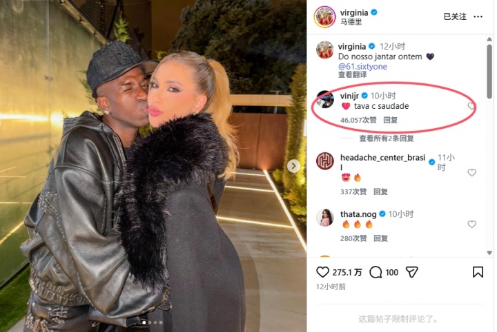 直播吧12月20日讯维尼修斯的女友维尔吉尼娅在社媒晒出了与男友在马德里共进晚餐的动态,维尼修斯评论道:想你了。