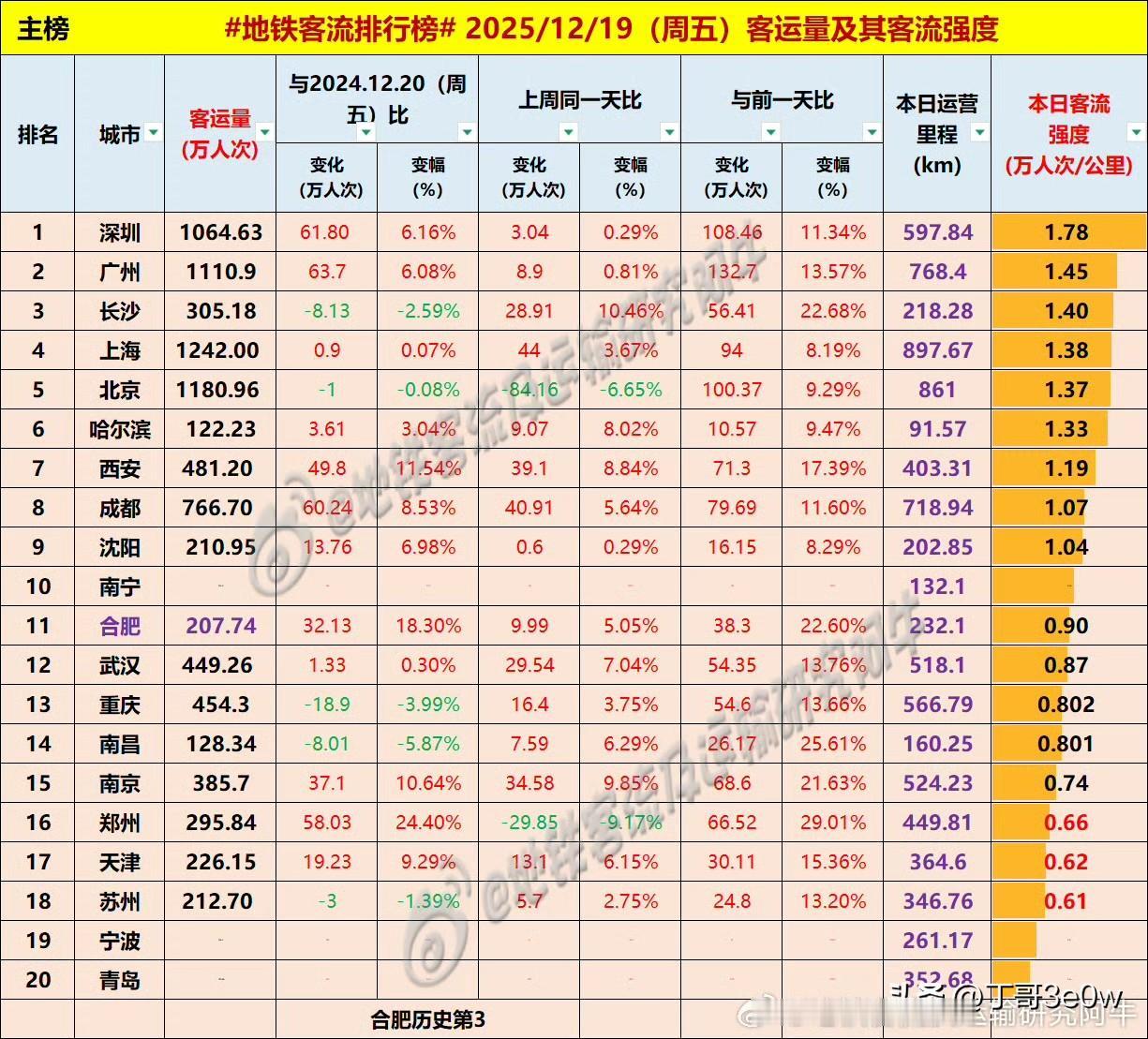 周五合肥地铁客流量达207万人次以上,历史第三高[呲牙][呲牙][呲牙] 爆料 身边事 排行榜 合肥地铁 周五 中国地铁客流日报 地铁客流排行榜 昨日客流 2025年12月19日 星期⑤ 全国重点城市轨道交通客流量排行榜: 上海:1242.00万 北京:1180.96万 广州:1110.90万广州地铁 深圳:1064.63万深圳地铁 成都:766.70万 西安:481.20万西安爆料 重庆:454.30万重庆身边事 武汉:449.26万武汉地铁 南京:385.70万南京地铁 长沙:305.18万 郑州:295.84万郑州爆料 天津:226.15万天津身边事 苏州:212.70万苏州地铁 沈阳:210.95万 合肥:207.74万合肥身边事 青岛:130万+青岛爆料 宁波:130万+宁波地铁 南昌:138.34万江西南昌身边事 南宁:120万+南宁身边事 哈尔滨122.23万