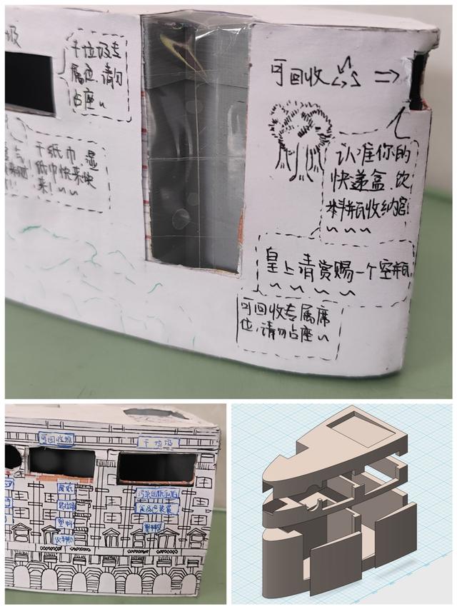 “游客说,拍照要避开垃圾桶,很麻烦,我们就把它设计成了武康大楼的外形,让它本身也变成一个‘打卡点’,垃圾桶上面还印着简要的地图”“我们发现有人总是会把垃圾扔在垃圾桶外面,我们就把投掷口放大,方便骑行者”“物理老师还建议我们做一个传动装置,垃圾投得准,就会有人从窗口出来招手”……说起自己的创意,大家滔滔不绝。