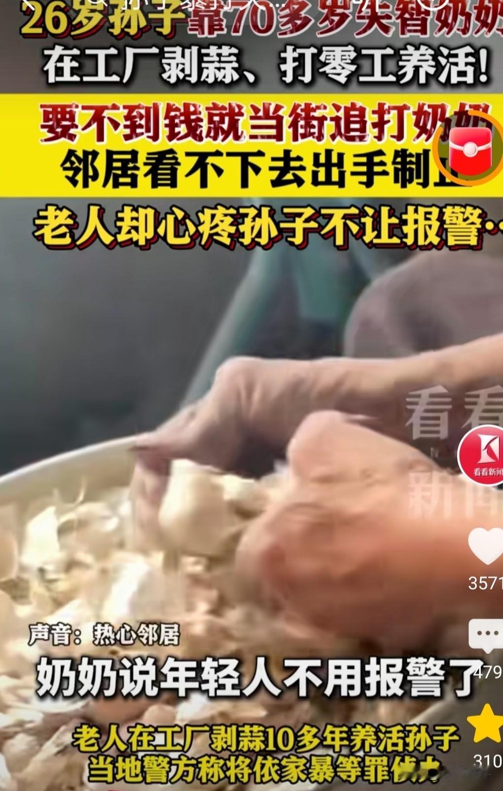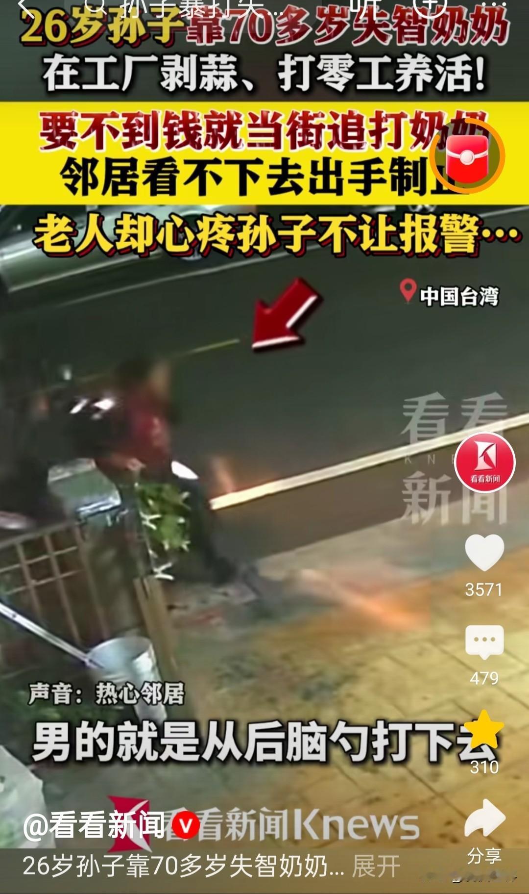 如此无底线的26岁孙子,真是一个“孙子”。 2025年12月17日,台湾省彰化县伸港乡的街头,一幕令人齿冷的场景刺痛了全网公众的神经:26岁的无业青年林某,将拳头和安全帽挥向了75岁的失智奶奶陈奶奶。只为索要上网费被拒,便对含辛茹苦养育自己的长辈当街施暴,这样的“孙子”,真是枉为子孙,彻底颠覆了人伦底线。 陈奶奶患有失智症,本该安享晚年,却在工厂剥蒜维生长达十余年。每两天才能领到的微薄工钱,不仅要维持自己的基本生计,还要养活早已成年的孙子林某。这位老人的双手,或许布满了剥蒜留下的伤痕与老茧,这份浸透汗水的收入,是她晚年仅有的尊严与依靠。可在林某眼中,奶奶不过是一台予取予求的“提款机”——父亲早逝、母亲离家的成长背景,让奶奶成了他唯一的依赖,却也让他在无底线的溺爱中,长成了心理断乳的“巨婴”。 长期游手好闲的林某,早已将向奶奶要钱视作理所当然,每两天一次的索取成了固定“流程”。此前便有过要钱不成打骂奶奶的恶行,而这一次,被拒绝后的施暴更是变本加厉:揪住头发、拳击头背、安全帽猛撞额头、推倒后补踹一脚,一系列动作凶狠残暴,全然不顾眼前是养育自己长大的至亲,更无视老人年事已高且身患失智症的脆弱。更令人唏嘘的是,被打得伤痕累累的陈奶奶,还在本能地护着孙子,拒绝邻居报警的提议,甚至常年向他人辩解“孙子只是不懂事”。这份毫无原则的溺爱,就像一剂慢性毒药,既纵容了林某的自私与暴戾,也让自己陷入了任人伤害的困境。 林某的行径,早已超出了“不懂事”的范畴,而是对人伦道德的公然践踏。26岁的年纪,本该是赡养长辈、扛起家庭责任的年纪,他却心安理得地啃老,甚至对供养自己的奶奶拳脚相加。这种生理成年、心理停留在婴儿阶段的“巨婴”,骨子里是病态的共生与全能自恋——他们分不清“我”与“你”的边界,认为家人的付出天经地义,一旦需求未被满足,便会以暴怒和攻击回应。而台湾地区相关法律明确规定,对直系血亲尊亲属实施暴行将从重处罚,等待林某的必然是法律的严惩,这既是对受害者的慰藉,也是对失德者的警示 。 这起事件引发的全网公愤,本质上是公众对孝道底线被突破的强烈谴责,更是对“无底线溺爱”教育悲剧的深刻反思。陈奶奶的爱没有错,但错在混淆了疼爱与纵容的边界,用无原则的付出养出了不懂感恩的“白眼狼”。正如现实中诸多案例所证明的,“巨婴”的养成从来不是偶然,而是家庭过度包办、规则缺失的必然结果——当爱失去了底线,便不再是滋养成长的雨露,而是摧毁人格的洪水 。 百善孝为先,赡养长辈是刻在血脉里的人伦底线,更是法律规定的责任义务。26岁的林某用拳头击碎了奶奶的晚年安宁,也击碎了自己做人的底线。这样的“孙子”,不配拥有长辈的疼爱,更不配得到社会的包容。希望这起悲剧能敲响警钟:爱孩子,既要给予温暖的陪伴,更要立下明确的规则;教会他们独立担当,懂得感恩回报,才是对子女真正的负责,也才能避免类似的人伦悲剧再次上演。