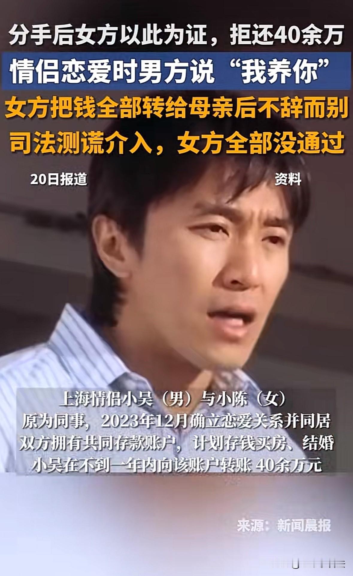 上海一对小情侣以女子名字开个共同账户存钱,不到一年时间,男子就存入40万。不久后女子失业,问男子愿不愿意养她,男子很爽快就答应下来。后来两个人商讨婚事,女子家里不同意,还转走共同账户里的57万存款,男子起诉女子还钱,女子就拿出聊天记录,声称两个人没有谈婚论嫁,男子转入40万元是为了养女子的生活开支。法院委托机构做司法测谎,测试结果出来后,法院判决大快人心!   小吴本以为同事发展成情侣的关系会比一般的情侣关系牢靠,可当全部存款被卷走的时候,小吴才后悔莫及。   小吴和小陈本是同事,相处久了渐生爱意,就发展成了情侣,并在2023年底搬到一起同居,同居期间的花销由小吴承担。   同居的日子过得还不错,小吴和小陈都有继续往下走的决心,于是就商议要攒钱买房。为了攒钱,还以小陈的名义开了个账户,两个人一起往账户里存钱。   为了能够尽快攒够钱买房结婚,小吴每个月往账户里打的钱几乎是全部的工资,有时候是一万多,有时候是几万块。   小吴憧憬着未来的幸福生活,却不曾想公司优化裁员,小陈是其中之一,两个人的未来堪忧。   小陈很担心未来的发展走向,心情很低落,询问小吴愿不愿意养她。小吴安慰小陈没关系,表示以后会养小陈。   不到一年的时间,小吴就往共同账户里转账40多万元,两个人也有了结婚的打算,于是小吴就带着小陈去见了父母。   小吴的父母对小陈很是满意,还当面给了11200元的订婚金。   可当小吴给小陈买了价值2万元的金手镯,并拿着3万元的礼物去见小陈父母的时候,除了吃了2碗面以外,连小陈父母的面都没见到。   小吴和小陈返回住处的时候心情都很不好,也不知道小陈的父母到底是个什么态度。   就在小吴不知道该怎么办的时候,小陈的母亲突然造访,还住进了出租房里和小陈小吴共同居住。   小吴本以为这是个表现的机会,可接下来的发展却让他惊掉下巴。   小陈先是没有告知小吴就转走共同账户里的57万元,然后又将小吴手机里的两个人的聊天记录清空,并和母亲一起从出租屋里搬离。   小吴无法理解小陈家庭的操作,即便是不合适也该提出来,卷走全部钱款一句话没留实在是让人心寒,于是将小陈告上法庭索要钱款。   小吴根据转账记录发现,共计转账给小陈412400元,其中小吴要还信用卡,小陈转给小吴9万元,但信用卡的消费其实也是用于两个人的生活开支。   小吴要求小陈返回购房款322400元,房屋租金26400元,金镯子折价款20000元,订婚金11200元。   小陈不同意返还,并提供出聊天记录,证明小吴转账的金额均是用于兑现自己的承诺,是小吴自己说要养小陈的,转账的钱就是用来养人的,并非购房款。   小陈还说小吴住在她租的房子里,大部分生活开支都是小陈支付的。双方并没有订婚的承诺,不存在订婚金,镯子已经还回去了。   小陈为了佐证小吴的钱都用来支付生活开支,打印了几十页的消费账单,无论是多少金额的消费凭据都有,证明钱已经花光,没有钱需要返还。   小吴手机里的聊天记录虽然已经被清空,但是电脑端还存有两个人的聊天记录,可以显示出两个人的确有商讨过买房事宜,存款是为了买房结婚使用。   双方不仅对于钱款的使用各执一词,就连是否还钱也是各执一词。   小吴说小陈一分钱都没还,小陈却说还了现金22万,还是分2次返还的,一次是14万现金,另一次是8个一万元现金。   因为是现金归还,并无相关凭证可以佐证,无法确认两个人谁说的是对的,只能借助司法测谎才能知道到底谁在说谎。   测谎实验一共提出4个问题,均是围绕是否存在共同存钱买房的情况,以及钱款到底是否返还到位来对两个人进行询问。   测试结果出来后,小吴很安心,因为小吴是通过的。但是小陈就惨了,因为小陈全部没有通过,也就是说小陈全部都在撒谎。   根据《最高法关于适用《民法典》婚姻家庭编的解释(一)》第5条的规定:当事人请求返还按照习俗给付的彩礼的,如果查明属于以下情形,人民法院应当予以支持:   (一)双方未办理结婚登记手续; (二)双方办理结婚登记手续但确未共同生活; (三)婚前给付并导致给付人生活困难。   适用前款第二项、第三项的规定,应当以双方离婚为条件。   小吴表示转账给以小陈名义开户的共同账户的金额,是为了以结婚为目的积攒的购房款,属于彩礼,结婚目的未达成,钱财应该予以返还。   法院酌情确定小陈返还给小吴钱款以及金饰折价款共计30万元,测谎时双方各自支付6000元费用,小陈承担不利后果,小吴的6000元由小陈支付。   7000元的诉讼费用,因小陈需要承担撒谎的不利后果,大部分诉讼费用由小陈承担。