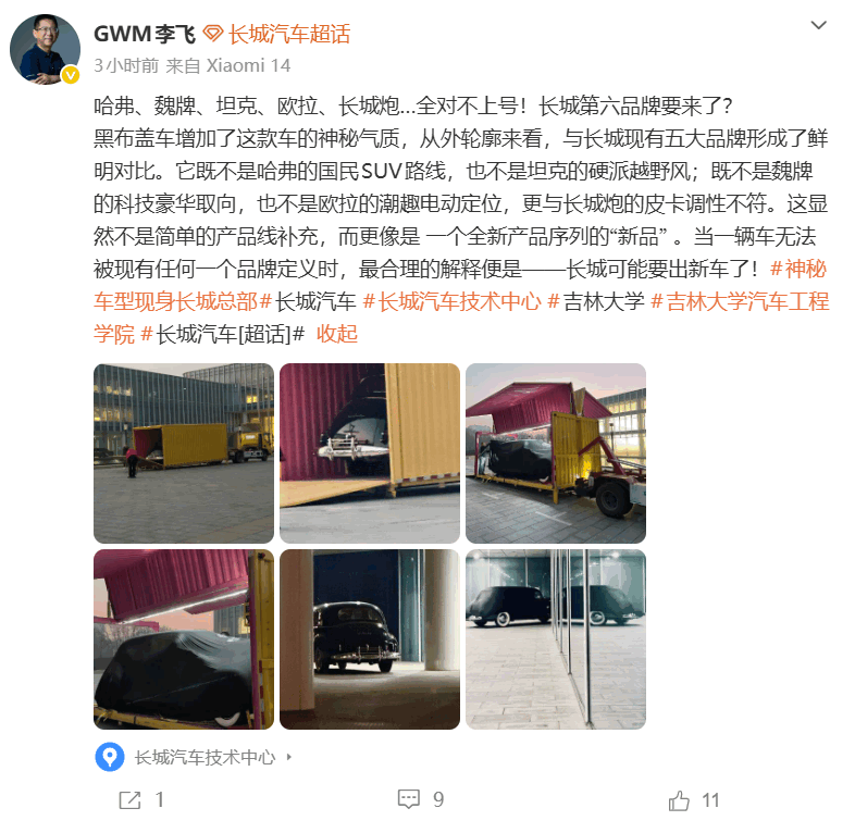 根据李飞在社交媒体上的描述,这款新车与长城现有五大品牌形成鲜明对比。它既不是哈弗的国民SUV路线,也不是坦克的硬派越野风;既不是魏牌的科技豪华取向,也不是欧拉的潮趣电动定位,更与长城炮的皮卡调性不符。新车被黑布遮盖,增添了神秘气质。从外轮廓来看,这显然不是简单的产品线补充,而更像是一个全新产品序列的“新品”。李飞直言:“当一辆车无法被现有任何一个品牌定义时,最合理的解释便是——长城可能要出新车了。”预告图显示,这款车完全采用“老爷车”的复古造型,配有大尺寸的镀铬后保险杠,车身圆润修长,圆灯、竖条镀铬格栅等元素也没有缺席,与当前市场上的主流产品风格迥异。