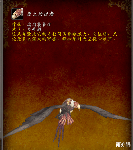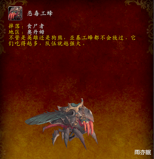 对应一只坐骑:恶毒工蜂,在亚基突袭期间,我们来到奥丹姆30.49位置,击杀稀有:食尸者几率掉落,差不多10分钟刷新一次每天一次拾取。