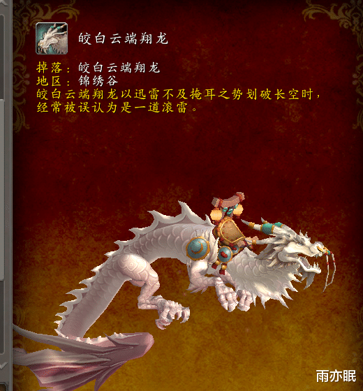 总共对应有5只坐骑可以拿,之前也给大家分享过,分别是:皎白云端翔龙、任衙的忠犬、亥离之嗣、馨劳、莱加尼翔龙。其中皎白云端翔龙是100%可以获得的,需要蹲守!