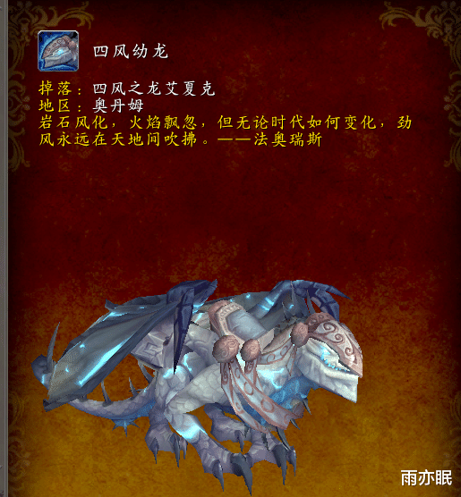 还有一只不依赖于突袭的坐骑:四风幼龙,也是8.3加入的。每天可以来到奥丹姆的74.83位置这里空中小亭子击杀四风之龙艾夏克几率掉落,同样每天来刷一次。四风幼龙刷新时间是2-6小时,可以借助集合石来蹲他。