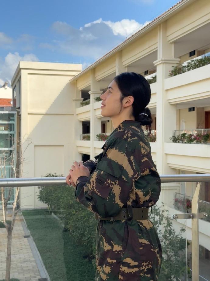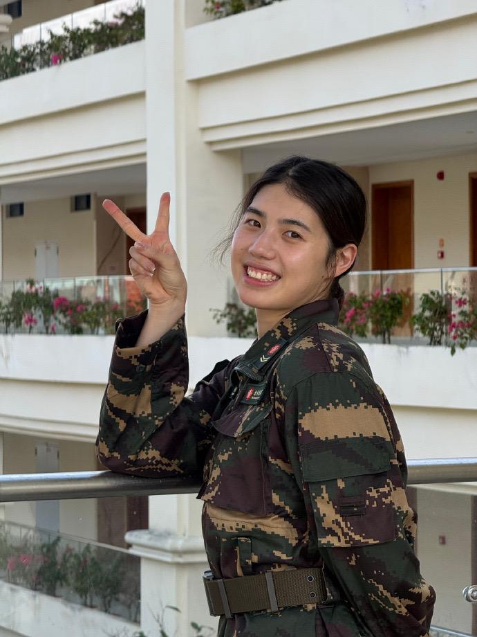 今天,张雨霏更新社媒晒多图,配文:很遗憾因为脚伤错过完整的军训。下次一定要学会匕首操,好酷。