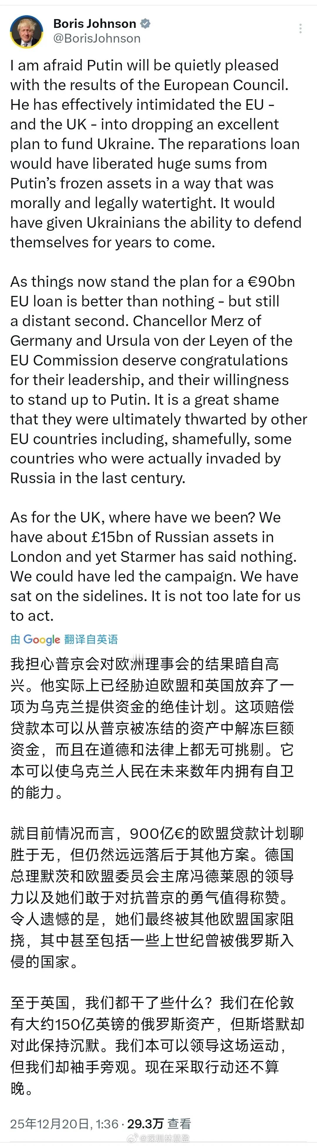 英国前首相鲍里斯·约翰逊今天(北京时间12月20日)发文写道:“我担心普京会对欧洲理事会的结果暗自高兴。他实际上已经胁迫欧盟和英国放弃了一项为乌克兰提供资金的绝佳计划。这项赔偿贷款本可以从普京被冻结的资产中解冻巨额资金,而且在道德和法律上都无可挑剔。它本可以使乌克兰人民在未来数年内拥有自卫的能力。就目前情况而言,900亿的欧盟贷款计划聊胜于无,但仍然远远落后于其他方案。德国总理默茨和欧盟委员会主席冯德莱恩的领导力以及她们敢于对抗普京的勇气值得称赞。令人遗憾的是,她们最终被其他欧盟国家阻挠,其中甚至包括一些上世纪曾被俄罗斯入侵的国家。至于英国,我们都干了些什么?我们在伦敦有大约150亿英镑的俄罗斯资产,但斯塔默却对此保持沉默。我们本可以领导这场运动,但我们却袖手旁观。现在采取行动还不算晚。”鲍里斯·约翰逊,这位在俄乌冲突中劣迹斑斑的前英国首相,今天又跳出来大放厥词。他任内为私利不断拱火俄乌冲突,英国《卫报》曾揭露他收受军火商克里斯托弗·哈伯恩100万英镑,进而阻挠2022年3月伊斯坦布尔和平协议的签署。如今约翰逊却装作“正义使者”大谈援助乌克兰。他口口声声指责欧盟和英国领导不力,却绝口不提自己种下的恶果。英国坐拥150亿英镑俄罗斯资产,在他的任内为何不行动?如今下台了,倒来指手画脚。