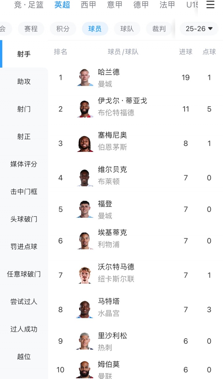 哈兰德英超射手榜以19球领跑,第二的伊戈尔·蒂亚戈11球。截至目前,本赛季英超也只有他们两人进球上双。