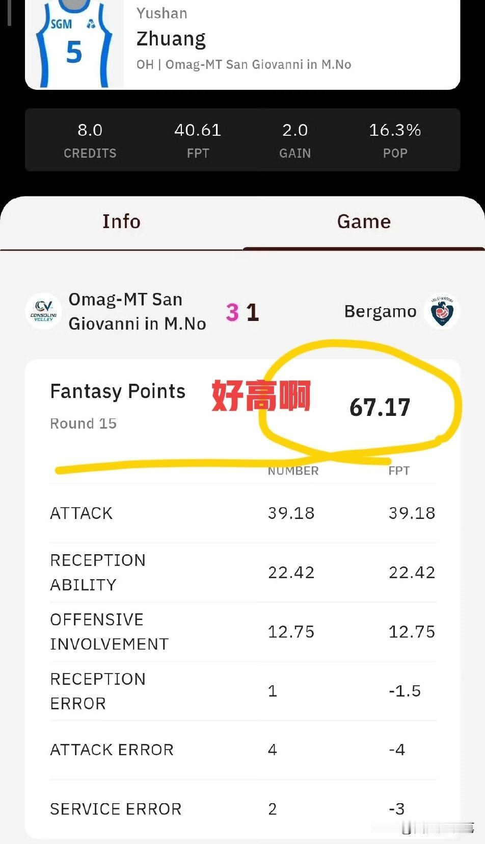 庄宇珊,这场巨星级表现,配得上MVP!一起看看 瞧,俱乐部人员开心地望着庄宇珊,脸上尽是对她的无限满意。的确,尽管对手一直追发她,她总是猫着腰,弯着腿,神情专注地接好每个一传,全场她耐心地接了26次,仅有1次失误。 看,抛球,起跳,盯球,扣球,一连串近乎完美地跳发姿势,累计发球18次,发的对手快要崩溃了。此外她从前排轰到后排,连拿27分,全场最高。 梦幻体育为她打出了67.17的高分,比她上次荣获最佳主攻的43.3分,还高了20多分。 雨刷的全面发挥,巨星级水平,值得颁发一个MVP土楼姑娘庄宇珊 庄羽珊意甲首秀