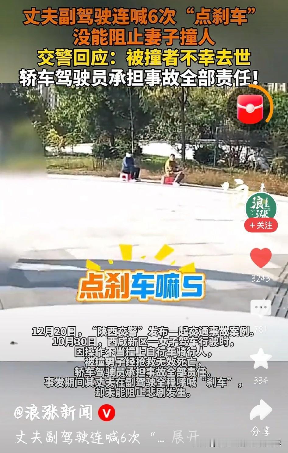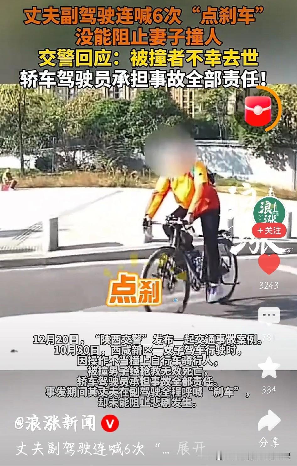 看得人窒息!丈夫连喊6次刹车,妻子还是撞了人 这段行车记录仪视频太揪心了!陕西西咸新区的马路上,副驾丈夫瞅见前方有骑车人,急得接连6声喊“点刹车”,嗓子都快破音了。 可妻子全程慌得手脚发软,嘴里只喊“哎呀”,甚至问出“刹车在哪”,最后径直撞上去,骑车人经抢救无效没了。 交警判定妻子负全责,说到底就是新手没经验,突发情况脑子“宕机”,把紧张变成了操作失误。更关键的是,副驾光喊“刹车”太模糊,要是说“踩右脚中间的踏板”,说不定能救急。 开车真不是小事,新手可得多练应急反应,陪驾的也别光吼,指令说清楚才管用! 丈夫连喊6次刹车没能阻止妻子撞人 丈夫6次喊刹车妻子仍撞人 驾驶安全警示 安全驾驶 交通安全