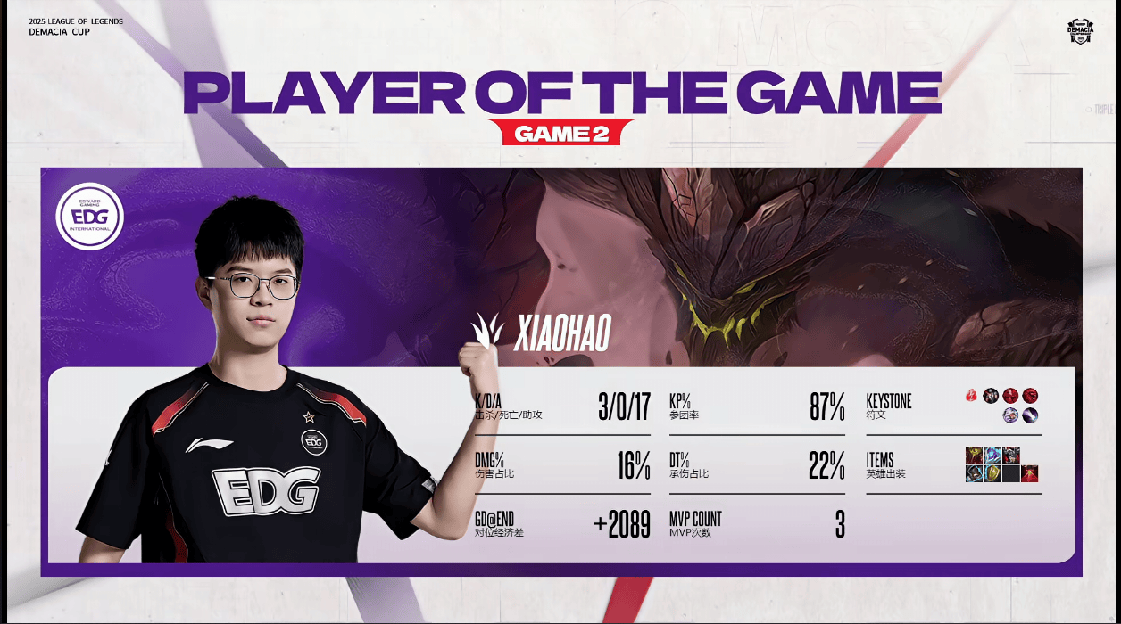 Xiaohao石头人打出3/0/17战绩,斩获EDG对阵LGD第二局MVP