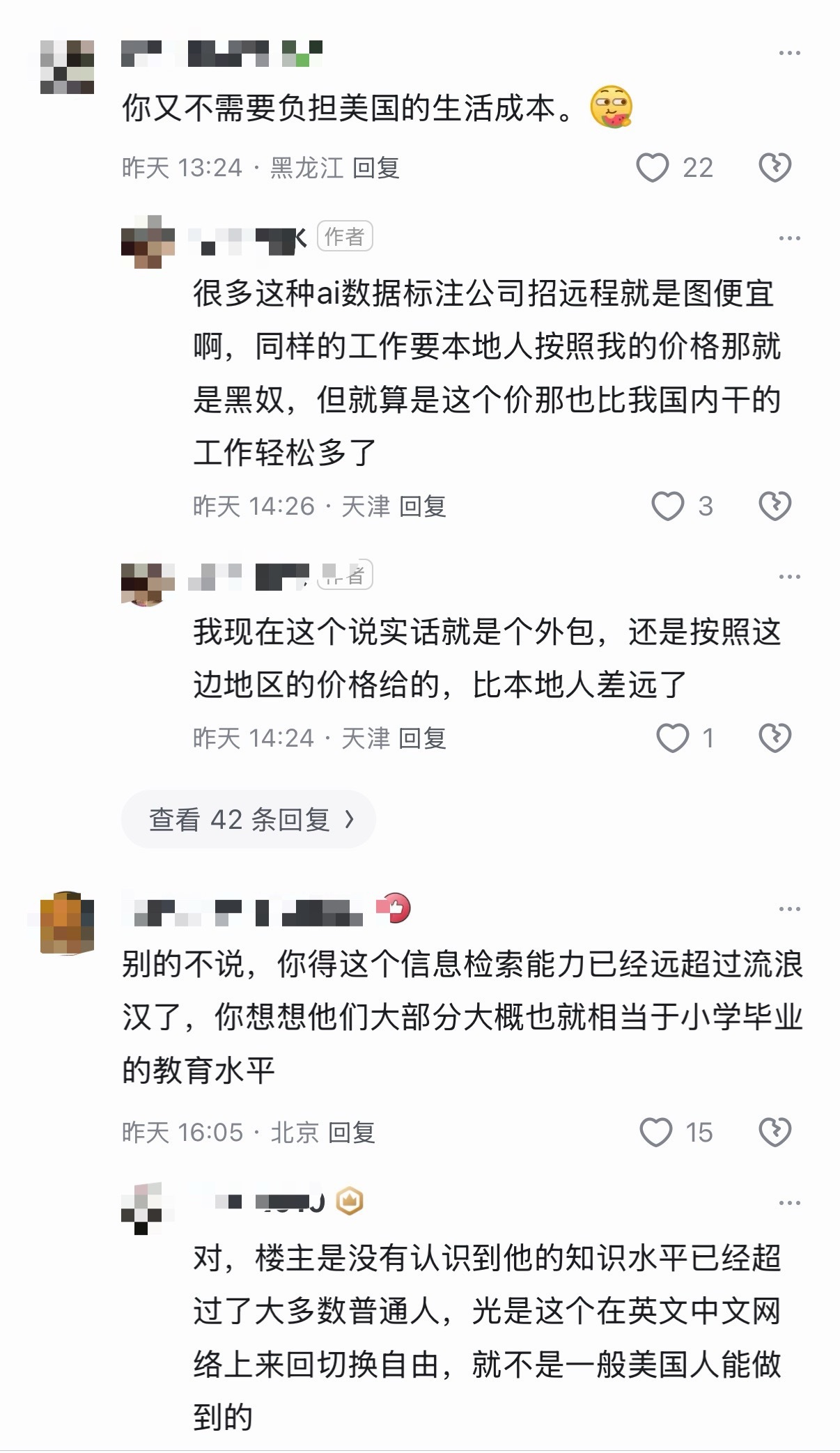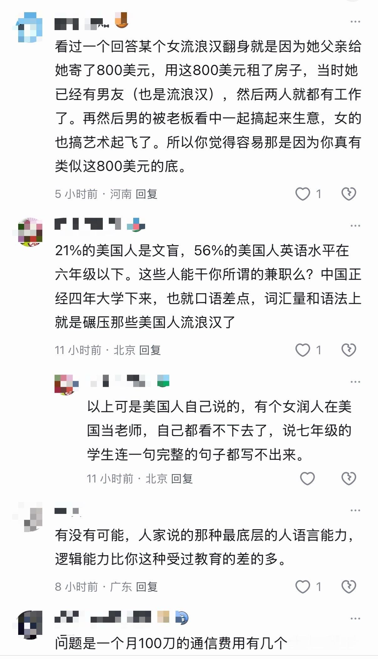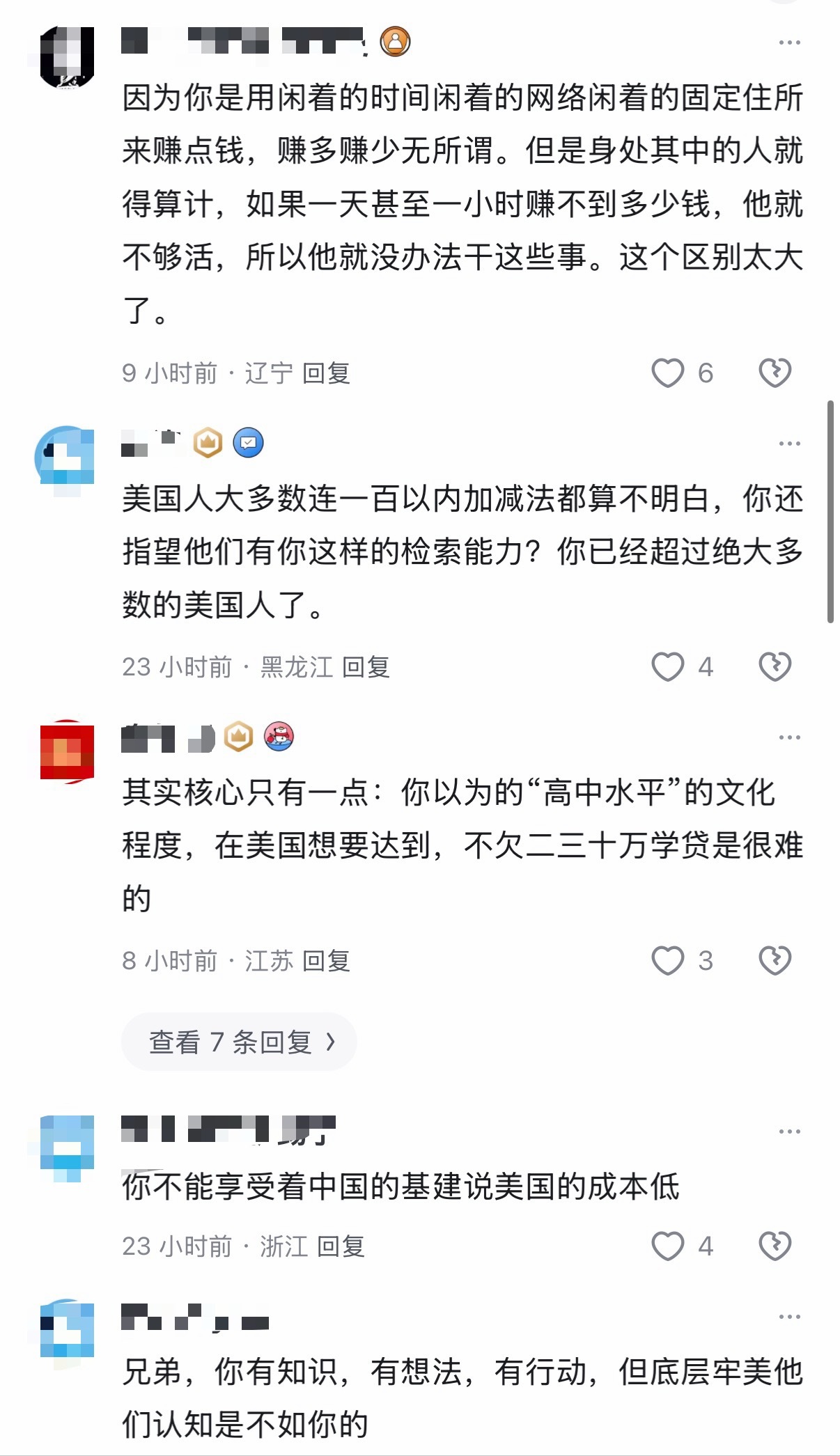 🔻社会主义国家把我们的公民保护的太好了,以至于给了这位up巨大的错觉:让他以为享受着东大便利的基建、享受廉价高等教育、有自己的电脑和住所以至于还有兼职时间可以跨洋去抢了美国人的远程工作机会、赚美刀花RMB等等以上一切是理所当然的。🔻红脖子之所以能被MAGA煽动起来排外,也有这方面的因素:一群人带着红脖子一辈子都接触不到的知识来到美国,混不下去了还有退路。🔻革命太彻底,以至于有人就忘记了革命的意义。🔻所以一些人理解不了:看似在我们这人人都有的基础教育知识本身也是有价格的,而有些知识在美国太昂贵了。热点现场海外新鲜事网友讨论美国存在斩杀线
