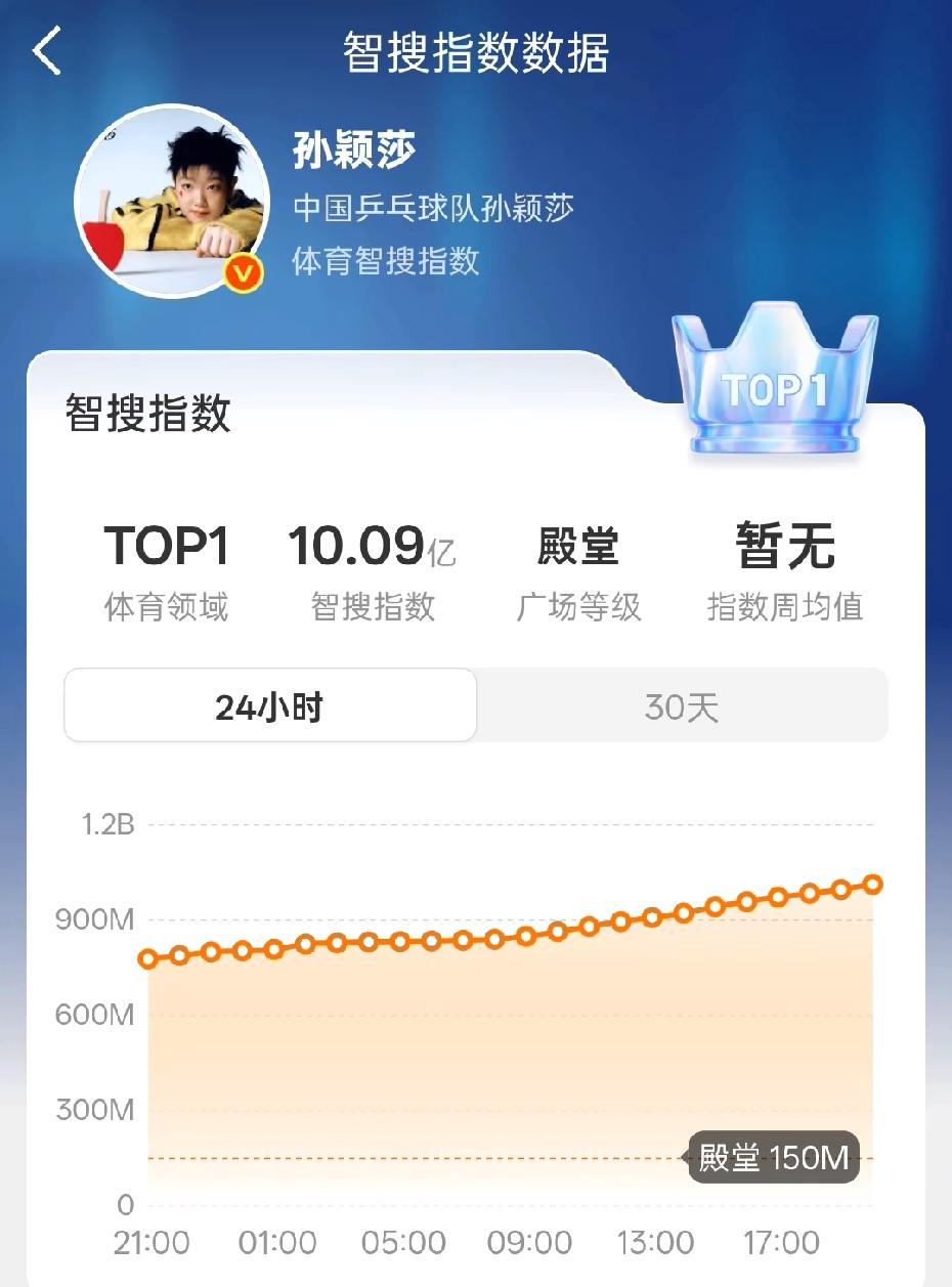 万万没想到, 这几天就算莎莎0出现、0比赛, 并且未宣商务的情况下, 孙颖莎的智搜指数竟然破了10亿。 这个10亿可了不得, 这是球迷们纯纯的想念呀。 这辈子参加过亿的项目都是莎莎的, 从这里能看出莎莎球迷的活跃度和数量。 虽然她在养伤, 但是她肯定能看到大家对她的喜爱, 她一定很开心。 真是“一生要强的中国女人, 把一个小姑娘捧到最高点。” 再次见证10亿少女孙颖莎, 能破孙颖莎记录的只有孙颖莎自己, 这句话我相信了。 冬至大如年, 人间小团圆, 也祝莎莎冬至快乐! 健康平安!! (图片源自于网络)
