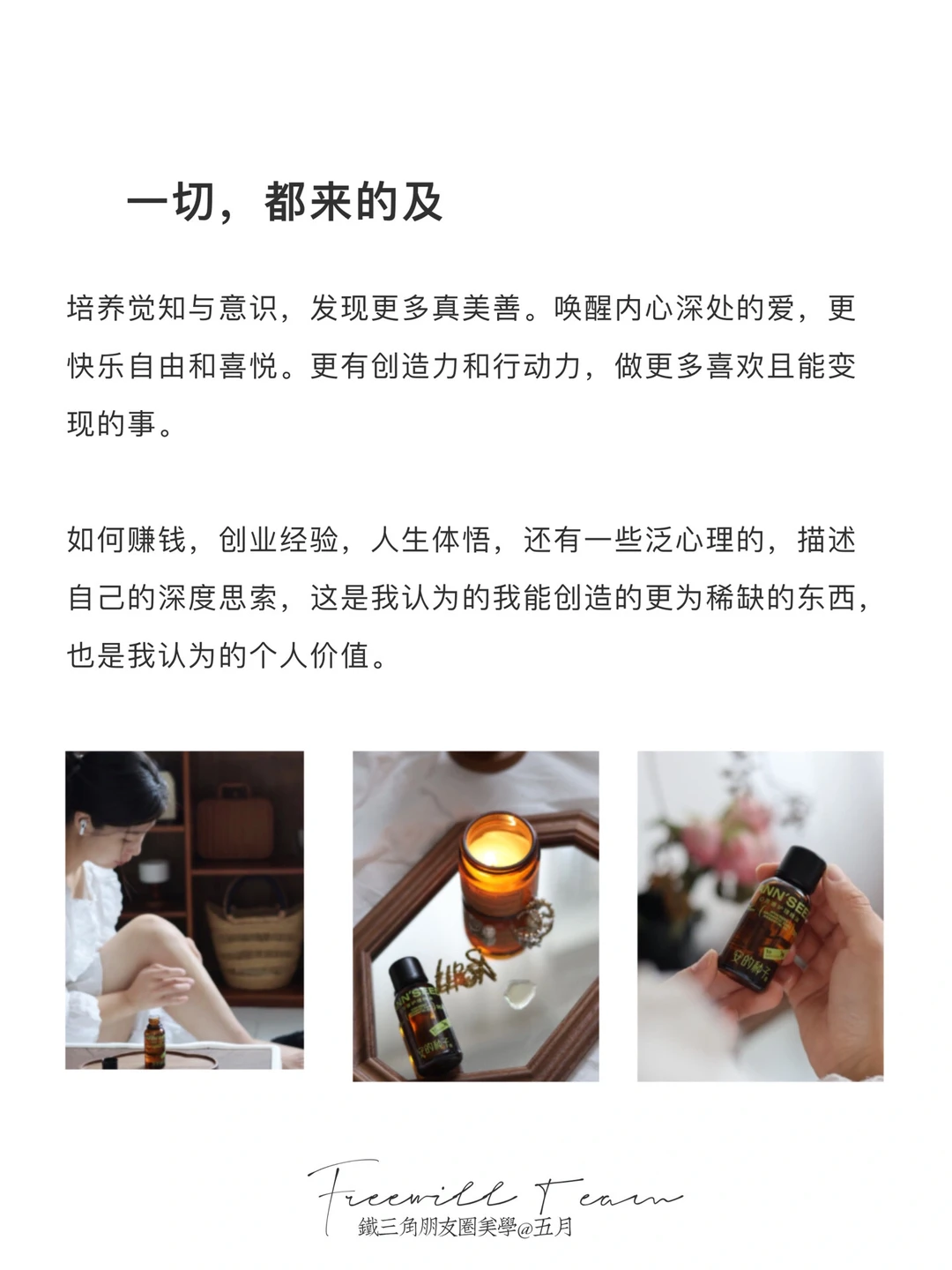 裸辞后,我看好自媒体,分析出它的突破一定是图和文,于是报了美学摄影文案的课程,跟着能影响自己的人一起提升。深耕自己,拥有了现在的曾经想要的自己。