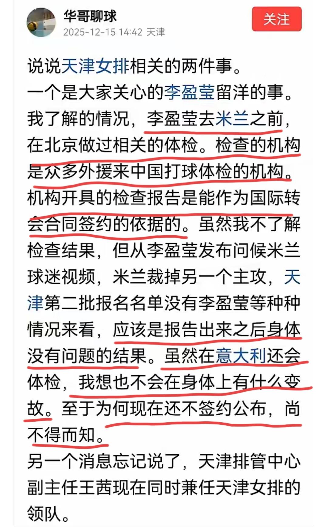 李盈莹留洋梦破灭继续发效:米兰俱乐部官方发文表示李盈莹体检并非不合格,而是这样表述的 李盈莹留洋被意大利豪门米兰俱乐部“劝返”回国,引起广大球迷热烈讨论。李盈莹到底是什么原因被米兰拒签的?各方揣测不一,坊间传言就一句话:李盈莹体检不合格。其实不然,就在北京时间12月21日下午,米兰俱乐部官方发文解释该俱乐部未能与李盈莹签约的原因时提到:李盈莹近期多次体检中结果显示存在一些身体原因,需要进一步的专家评估;并以命令的口吻要求中方拿出最合适的治疗方案以尽可能(冷静)负责地处理此事。 或许天津渤海银行俱乐部并没有拿出最合适的“治疗方案”,于是,该俱乐部的解释文中才有这一句:李盈莹本人,米兰俱乐部,经纪公司金色体育和天津渤海银行俱乐部四方共同协商后宣布决定李盈莹回国治疗,各方一致认为,保护运动员的健康及其运动生涯和个人生活的未来为首要任务。 看来,米兰俱乐部的这一纸解释文自认为非常清晰的解释了他们为什么拒签李盈莹。笔者倒是认为,米兰俱乐部这分明就是耍流氓、耍无赖!天津华哥近日就李盈莹出国留洋打球的体检问题专门发文表示,“李盈莹去米兰之前,在北京做过相关的体检。检查的机构是众多外援来中国打球体检的机构。机构开具的检查报告是能作为国际转会合同签约的依据的。”华哥的文章已经说明李盈莹的身体是没有问题的,而且大中国的权威机构还出具了相关报告。 看来,李盈莹被米兰俱乐部拒签的真实原因扑朔迷离。笔者始终认为,米兰俱乐部已经有15名队员(满员,不缺主攻,图四),加上队长是特别怕受伤的埃格努,而经纪公司又基于自身利益一厢情愿将李盈莹“推荐”到米兰,导致米兰俱乐部拒签更靠谱。