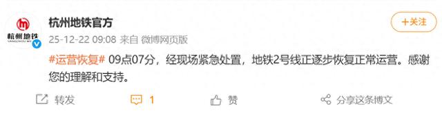 12月22日上午9点08分,杭州市地铁集团有限责任公司官方微博@杭州地铁官方发布运营恢复消息: