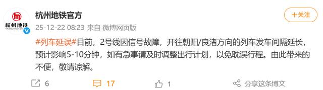 目前,2号线因信号故障,开往朝阳/良渚方向的列车发车间隔延长,预计影响5-10分钟,如有急事请及时调整出行计划,以免耽误行程。