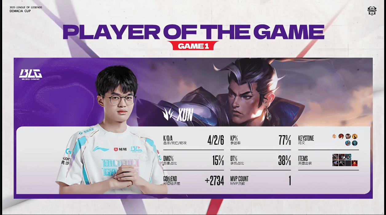 欢迎回归!Xun打出4/2/8战绩斩获BLG对阵LNG第一局MVP