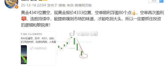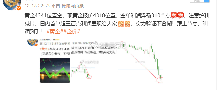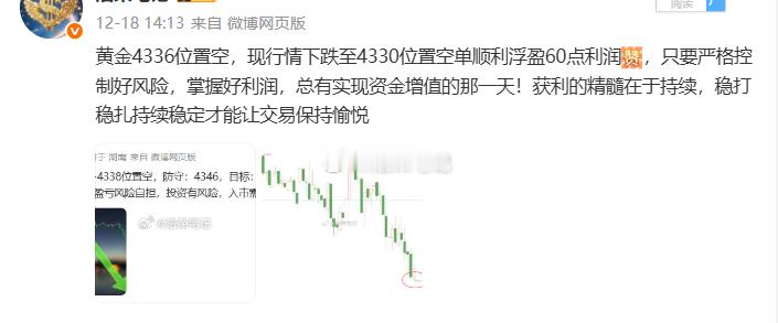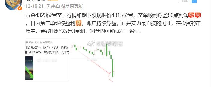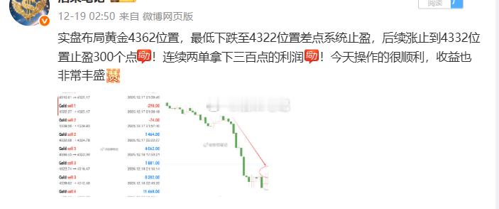 2025.12.18日周四操作记录总结!黄金4336位置空,在4322位置获利140个点黄金4323位置空,在4315位置获利80个点黄金4341位置空,在4310位置,获利310个点黄金4362位置空,在4332位置获利300个点博文公布4单,全部盈利共斩获830点利润,对于这份答卷我认为是非常值得骄傲,一切也都在实力范围之内稳步发展,部分实盘已经完成目标,也是得益于严格遵守了浩荣日常制定操作纪律。