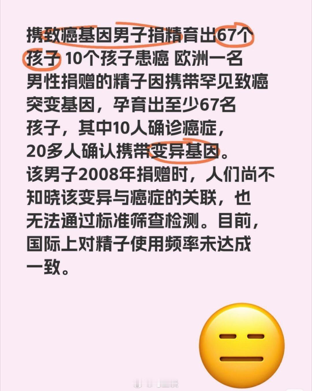 欧洲精子库一份致癌的精虫生下200个孩子,67个子女患癌,已有多人死亡…这就是国内中介吹嘘的北欧高富帅精子?不加疾病基因筛查就算,居然生了这么多…希望患癌的当中没有国内生的混血儿吧…一份致癌的精子生下200个孩子捐精者基因突变导致多名儿童患癌