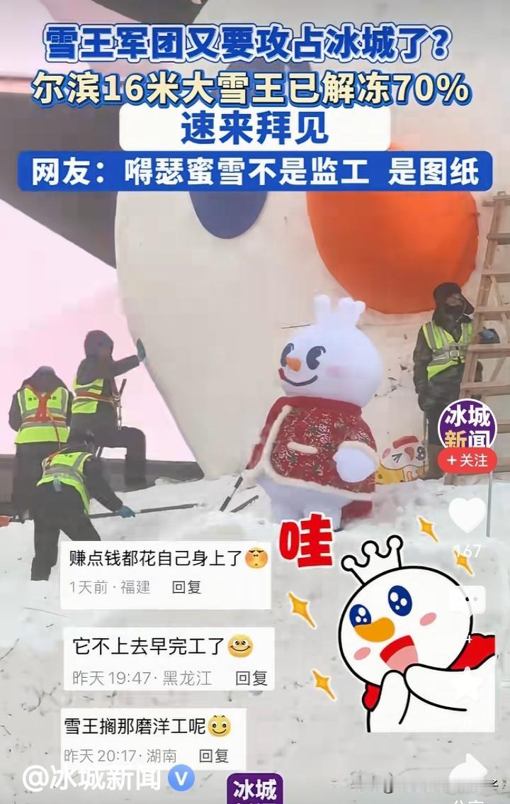 哈尔滨16米大雪王解冻的消息还挺让人唏嘘。近日,网友拍到中央大街的雪王雪雕被挖掘