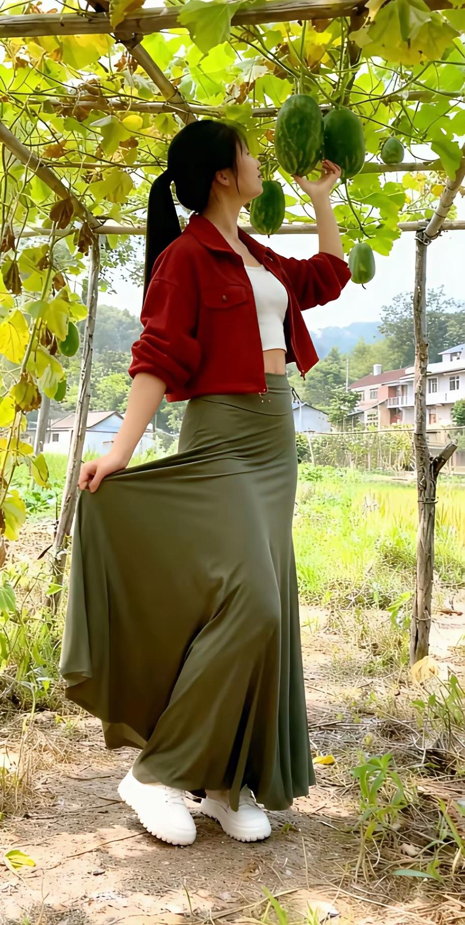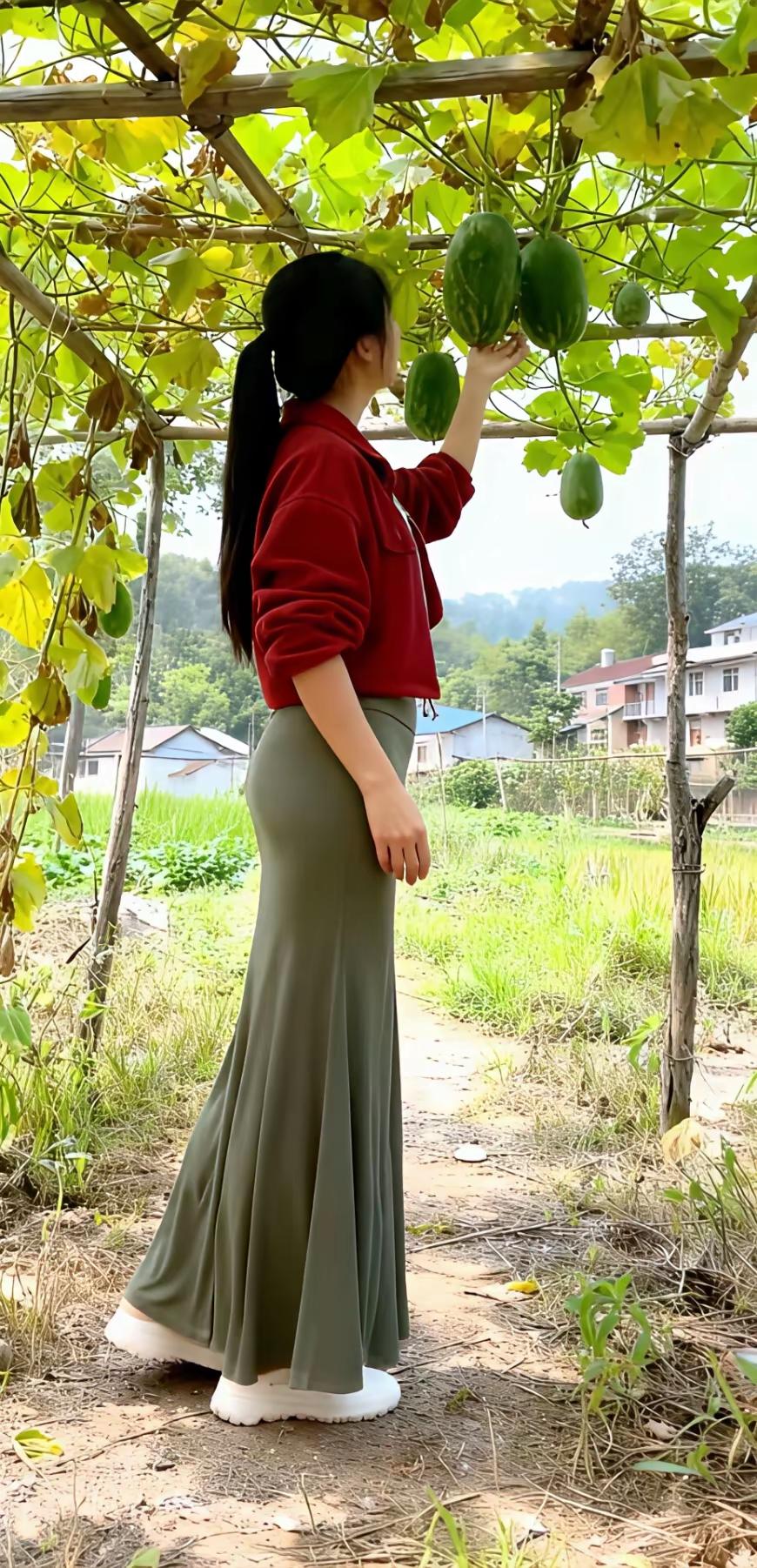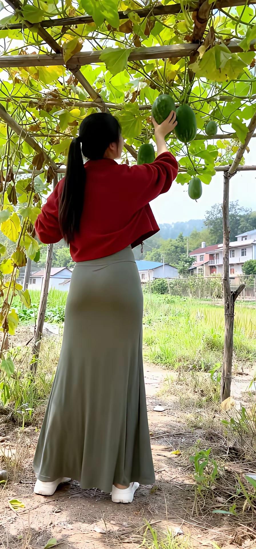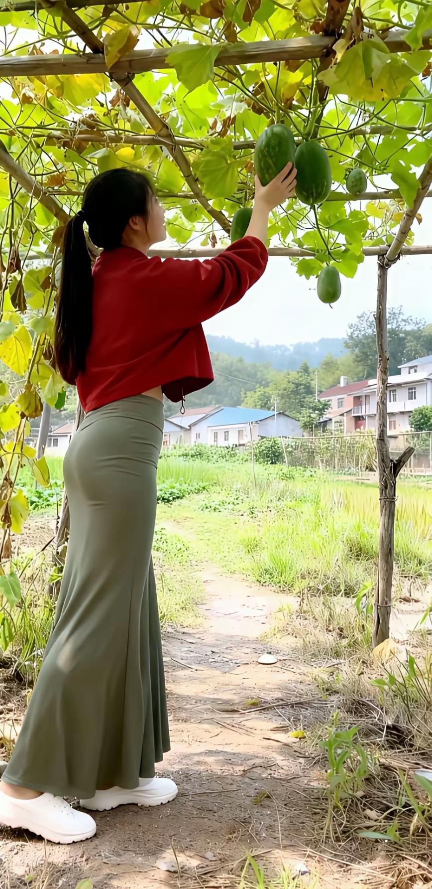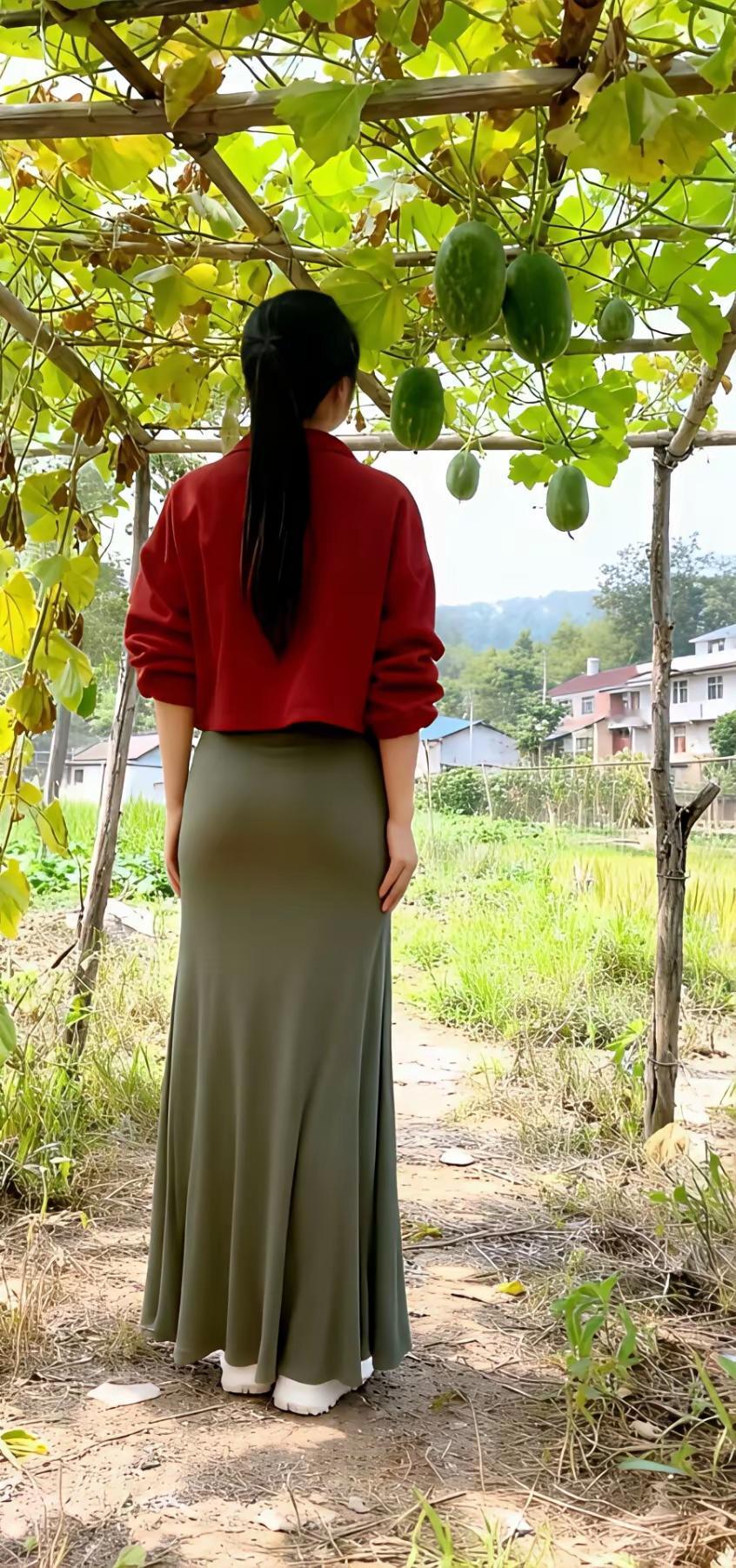 一位身着红衣绿裙的佳人,静静地伫立在瓜藤前,微风轻拂,衣袂飘飘。没有都市的喧嚣,没有生活的纷扰,只有岁月缓缓流淌。 我们总在忙碌中奔波,却忘了停下脚步,去感受这般纯粹的美好。或许偶尔让自己沉浸在这样的意境里,心灵也能得到片刻的栖息。