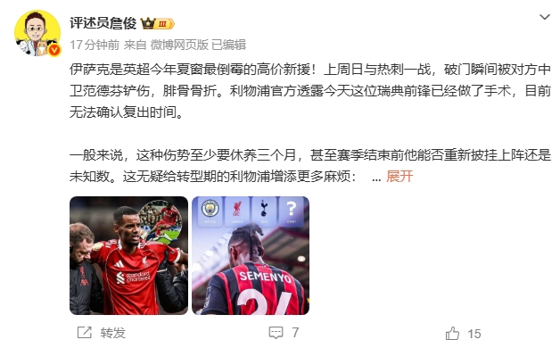 直播吧12月23日讯利物浦官宣伊萨克伤情,伊萨克腓骨骨折、踝关节受伤,已经接受手术。随后评述员詹俊发文。