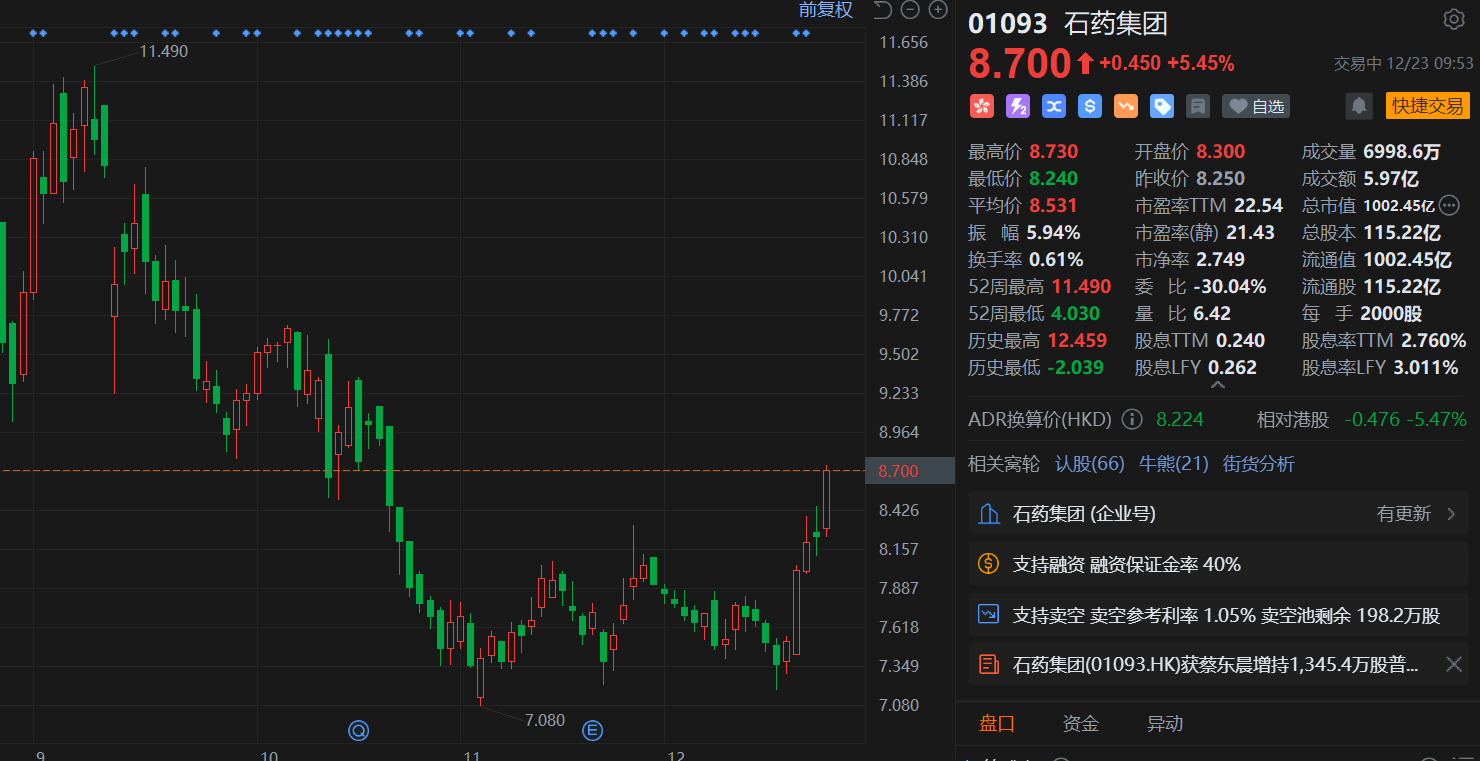 格隆汇12月23日|石药集团(1093.HK)持续上涨行情,目前涨5.5%报8.7港元,近4日累计升幅近20%,总市值重回千亿港元大关。消息上,根据香港联交所最新披露的文件,蔡东晨于12月22日以每股均价8.1957港元增持石药集团345.4万股普通股股份,价值约1.1亿港元。增持后,蔡东晨最新持股数目为29.1亿股股份,好仓比例由25.14%升至25.26%。