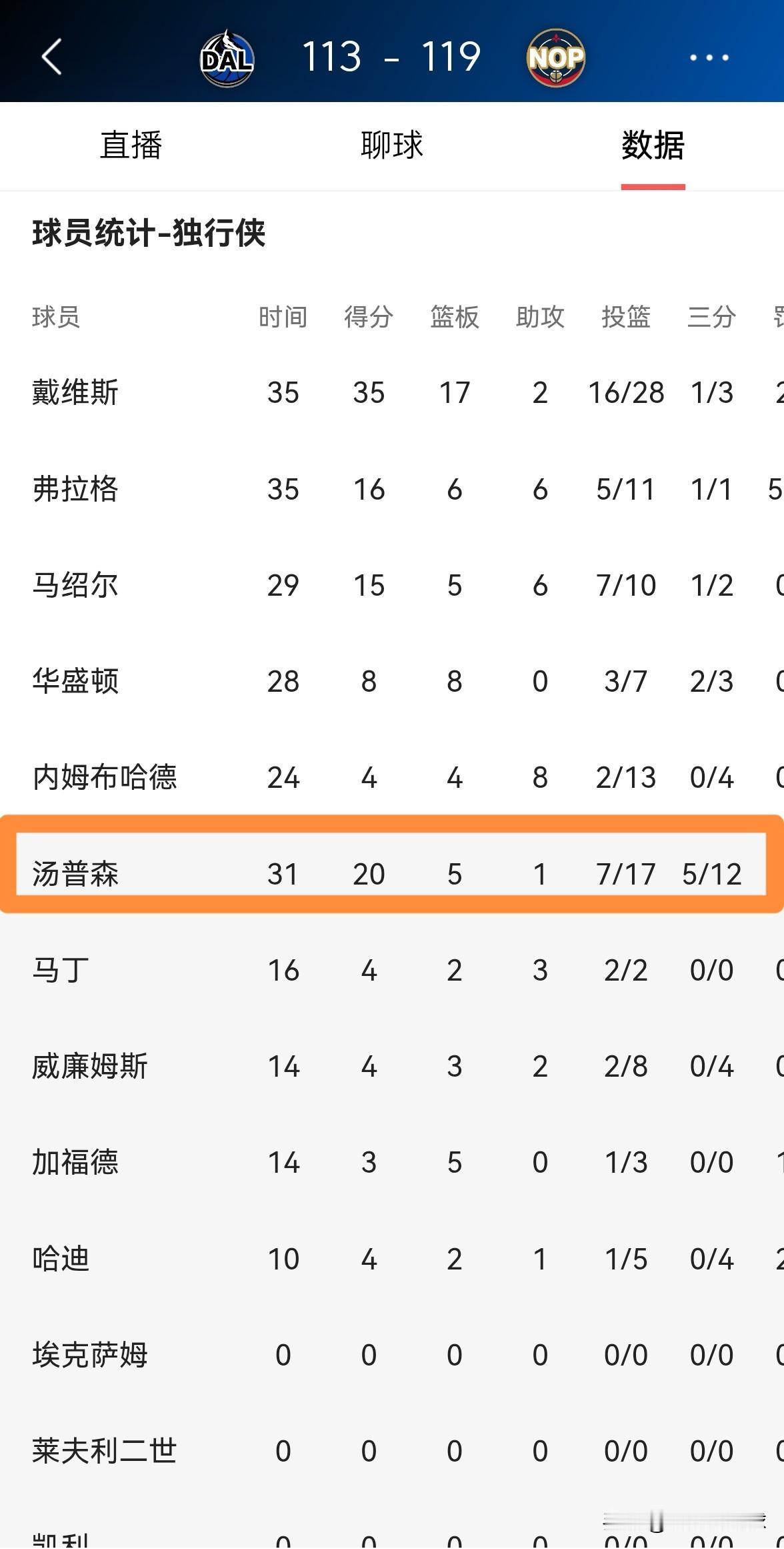 独行侠神射手汤普森真是冰火两重天!在今天独行侠客场以113:119不敌鹈鹕的比赛中,汤普森在上下半场简直是判若两人。 全场比赛下来,汤普森替补出战31分钟,投篮17中7,其中三分球12中5、罚球3中1得到20分5篮板1助攻。值得一提的是,在上半场比赛中,手感火热的汤普森就砍下20分4篮板1助攻,可是在下半场比赛中,汤普森竟然投篮5中0怒砍0分。 坦白说,以汤普森在下半场比赛中的表现来看,他完全辜负了主帅基德的信任。