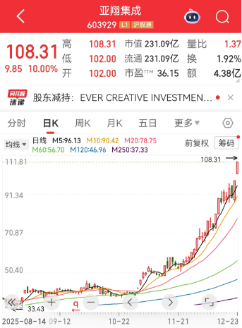 人民财讯12月23日电,12月23日早盘,亚翔集成(603929)股价再次涨停,最新股价首次突破100元/股大关,达到108.31元/股,创下历史新高。公开资料显示,亚翔集成主营业务为IC半导体等高科技电子产业的建厂工程提供洁净室工程、工艺二次配工程及建筑工程等服务。今年前三季度,公司实现净利润4.42亿元,同比增长0.78%。