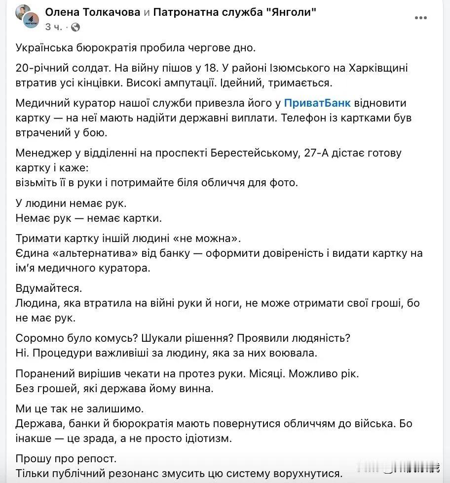 羞辱失去四肢的伤残军人,乌克兰银行遭全民讨伐 乌克兰“普里瓦特”银行陷入争议漩涡。 一名在俄乌冲突中失去所有手脚的乌克兰退伍军人被银行工作人员要求“你想想办法,拿起银行卡并举到身前拍照”,以便恢复银行卡的款项支付功能。 乌克兰银行的做法引发民众愤怒,“天使”慈善机构负责人叶莲娜·托尔卡切娃称,带这名退伍军人去银行办手续的护理人员被禁止代替伤残军人拿银行卡拍照,因为“在银行里这样做是不允许的”。 “普里瓦特”银行已公开道歉,还承诺将尽快为退伍伤残军人提供金融服务。