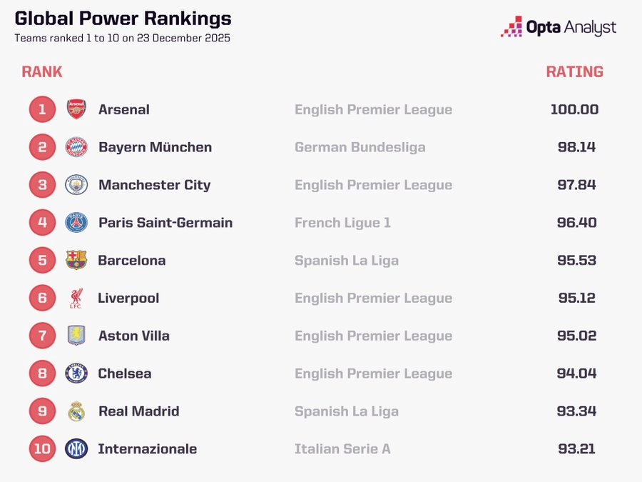 虎扑12月23日讯著名统计机构OPTA更新了现阶段全球俱乐部的排名名单,阿森纳排在第一,拜仁,曼城位居第二和第三位。