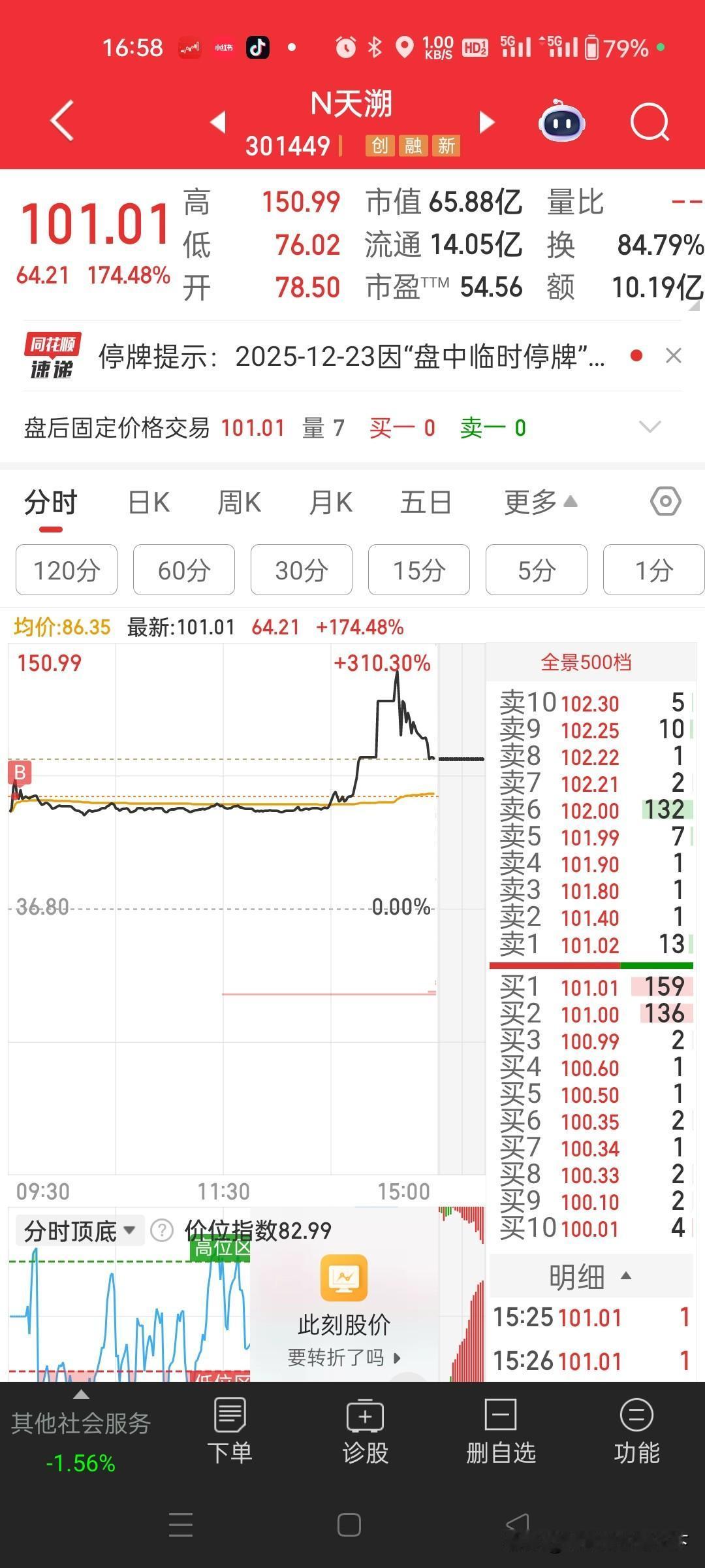 ,最高涨幅695.4%今日上市三新股全部异动暴动!均出现大幅异动,最高涨幅695.4%。午后集体触发两次临时停牌 。圣诞🎄元旦行情预热。 2025年12月23日,A股的N纳百川(301667)、N天溯(301449)、N锡华(603248)三只新股同日上市,均出现大幅异动,午后集体触发两次临时停牌 。具体情况如下 : - N纳百川:开盘即涨165.13%,午后14:00涨幅触及244.7%触发首次临停,14:13涨幅飙至324.2%,二次临停落地。复牌后最高冲至180元/股,较发行价暴涨695.4%。截至收盘,涨幅回落至408.2%,报115元,成交额超14.54亿元,换手率高达86.16%。 ​ - N锡华:开盘上涨181.68%,盘中涨幅突破350%触发二次临停,最终收涨264.5%,报36.81元,成交额15.29亿元,换手率为80.28%。 ​ - N天溯:开盘上涨113.32%,涨幅扩大至242%时触发二次临停,收盘涨幅定格在174.5%,报101.01元,换手率84.79%,成交额超10亿元。 三只新股异动的原因主要是所处赛道优质,风电、新能源热管理、检测认证都是高景气领域,叠加年底新股炒作情绪,资金追捧热度高。