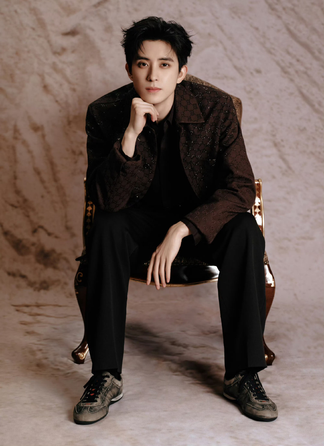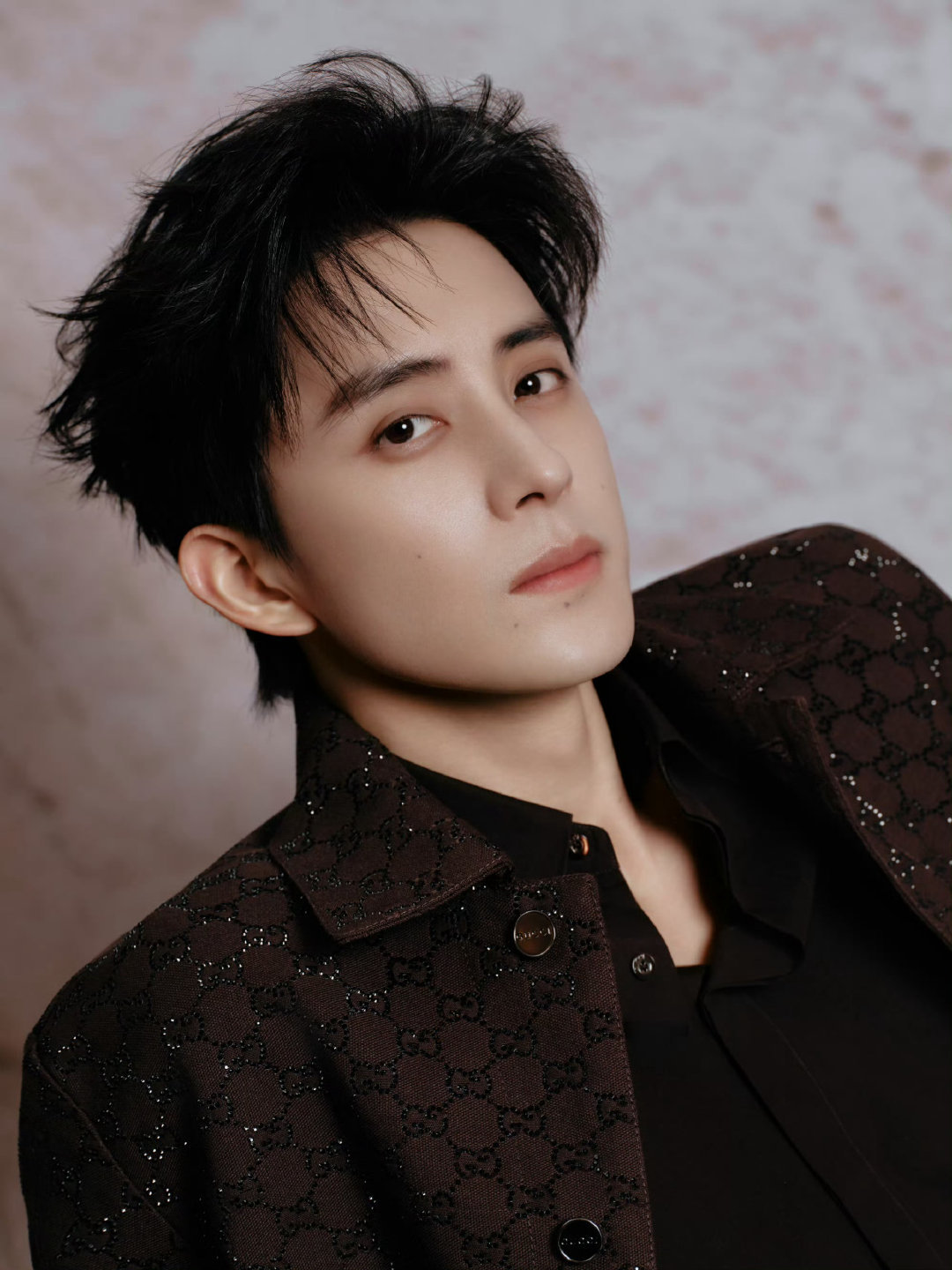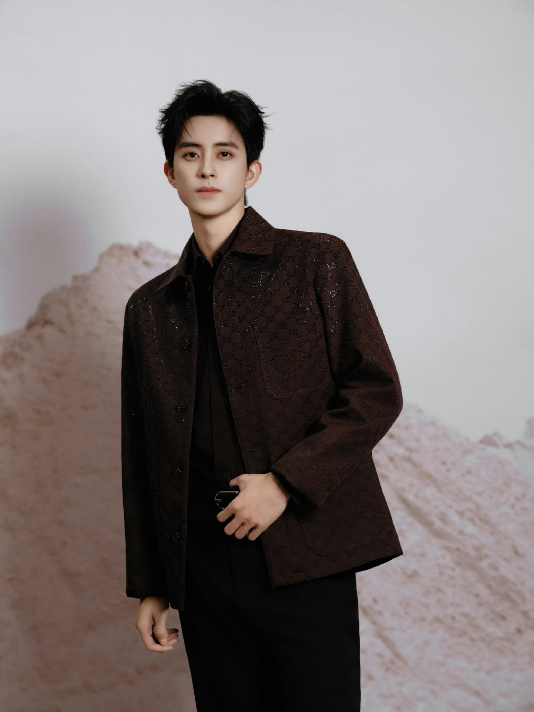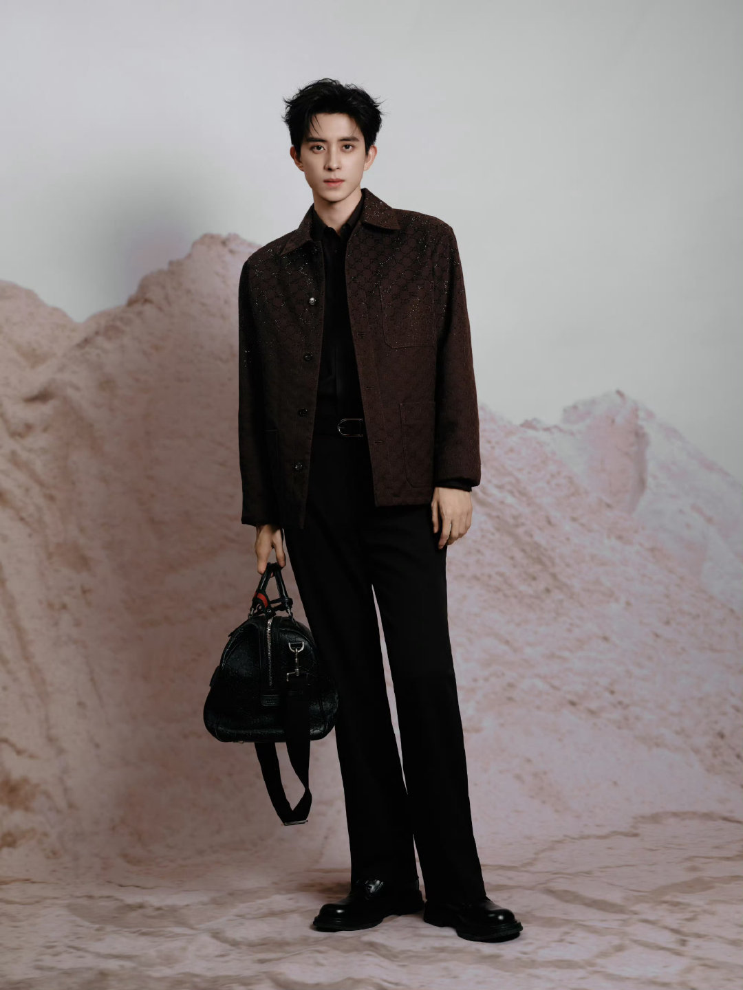 敖瑞鹏|Gucci Beauty直播造型出图,身穿同品牌棕色刺绣夹克,缀以细闪亮