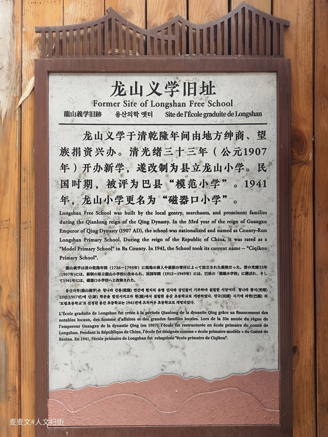 龙山义学旧址,是重庆磁器口古镇深厚历史文化的重要见证。该义学始建于清乾隆年间,由当地乡绅通过“斗息捐”形式捐资兴办,最初位于宝轮寺大雄宝殿侧后,原属宝轮寺庙产。清光绪三十三年(1907年),龙山义学改制为县立龙山小学,民国时期因办学成绩卓著被评为巴县“模范小学”。1941年,学校更名为磁器口小学,并沿用至今,校名匾额上的“百年磁小”题字承载着其跨越世纪的办学历史。