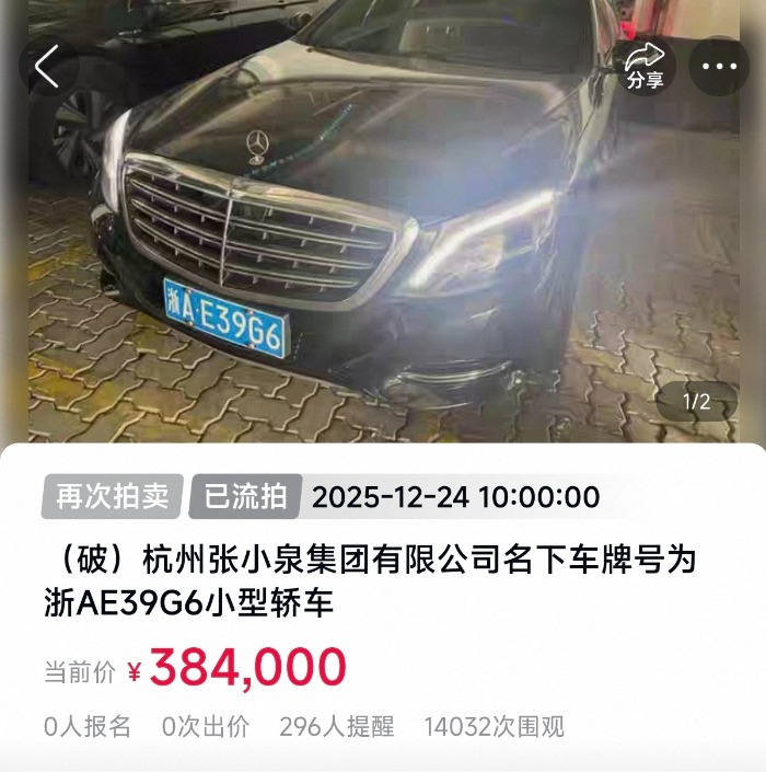 大皖新闻讯12月24日上午10时,大皖新闻记者从阿里资产平台看到,“(破)杭州张小泉集团有限公司名下车牌号为浙AE39G6的小型轿车”的标的再次拍卖流拍。这是继前两次流拍后的第三次拍卖,起拍价由60万元降至48万元后,再次下调至38.4万元。