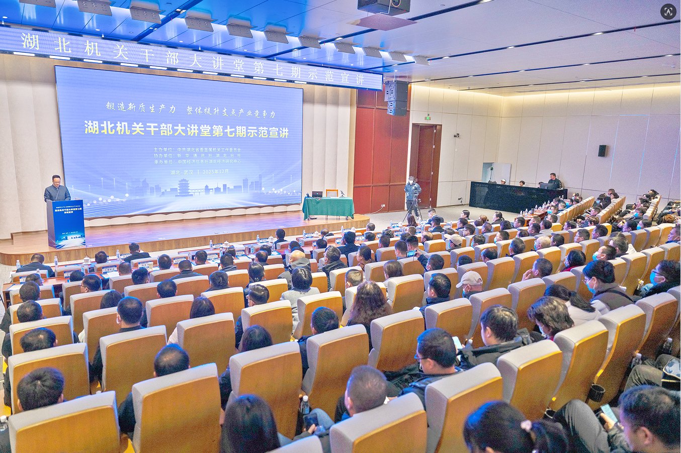 12月23日,由湖北省委直属机关工委主办、新华社湖北分社协办、中国经济信息社承办的湖北机关干部大讲堂第七期示范宣讲活动在武汉举行。活动以“锻造新质生产力整体提升支点产业竞争力”为主题,省直有关单位党员干部代表230余人参加学习。